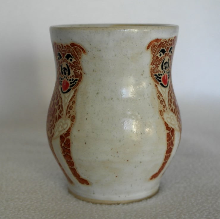 A hand thrown stoneware pottery mug with an image of a Staffordshire Bull Terrier (SBT) on each side. This mug is 11cm tall and decorated with soft, satin glazes.