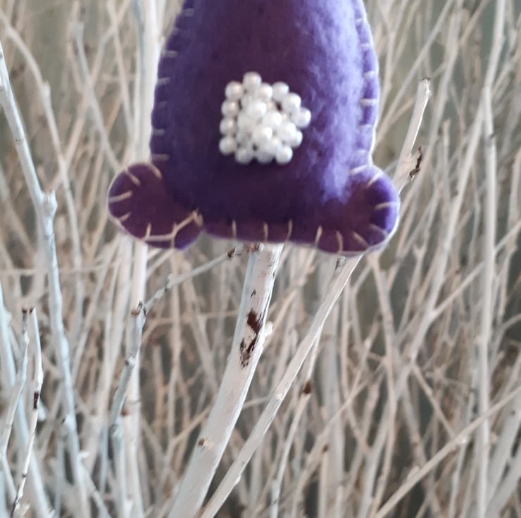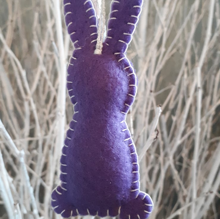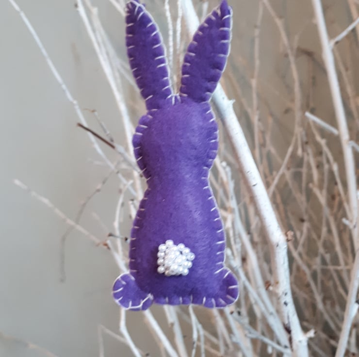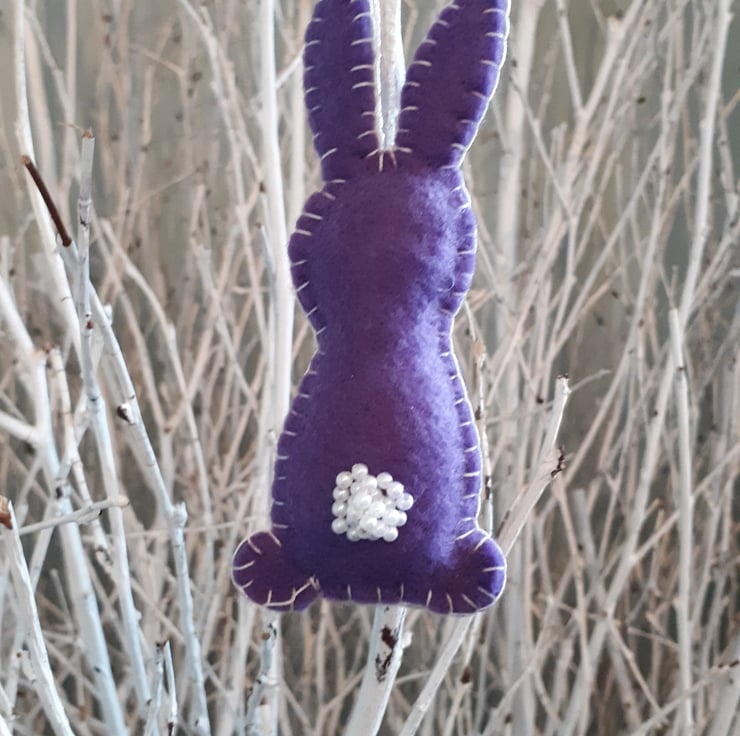 Easter bunny hanging decoration made using purple felt, white thread and pearl seed beads.