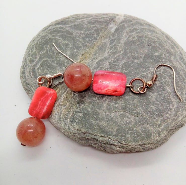 This very attractive jewellery set is made using different shapes and sizes of shades of pink jasper and raspberry quartz beads pink glass beads. The sizes of the beads range from 8 mm to 12 mm round beads and 20 mm x 12 mm and 15 mm x 10 mm rectangular beads and 8 mm clear glass bead. The earrings have silver plated ear wires and the necklace and bracelet have silver plated lobster clasps.