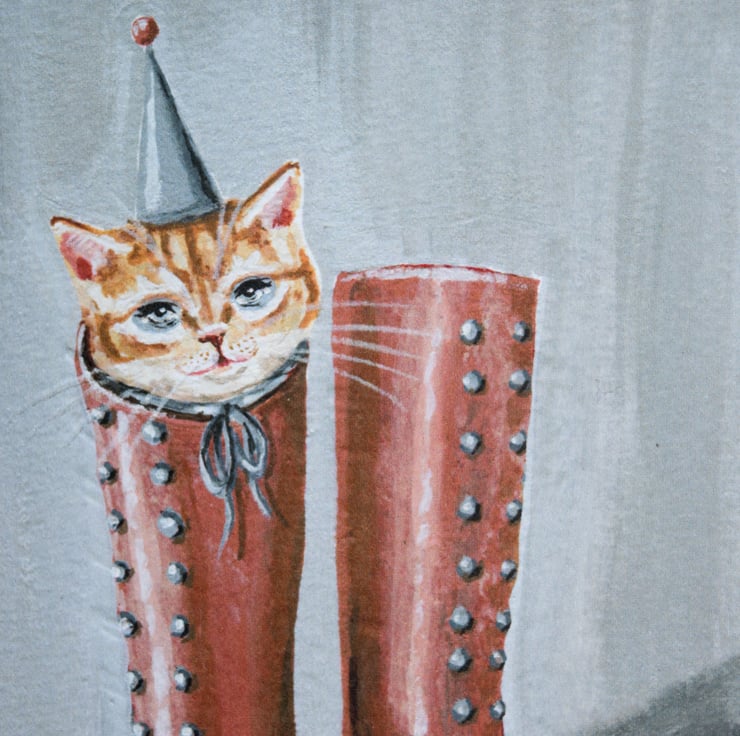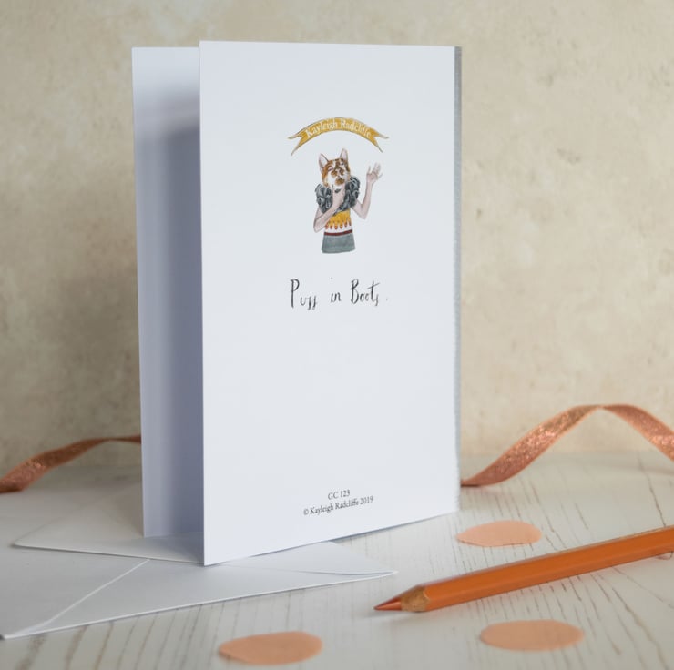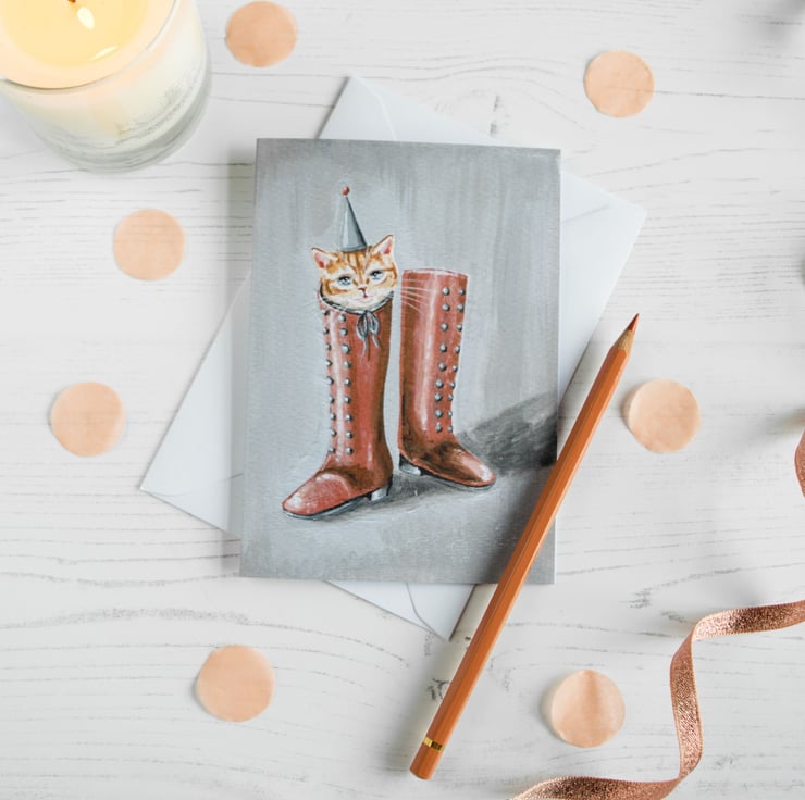 A sweet blank greeting card featuring a ginger tom cat in a pair of vintage of boots- Puss in Boots! The card has been designed and illustrated by myself.