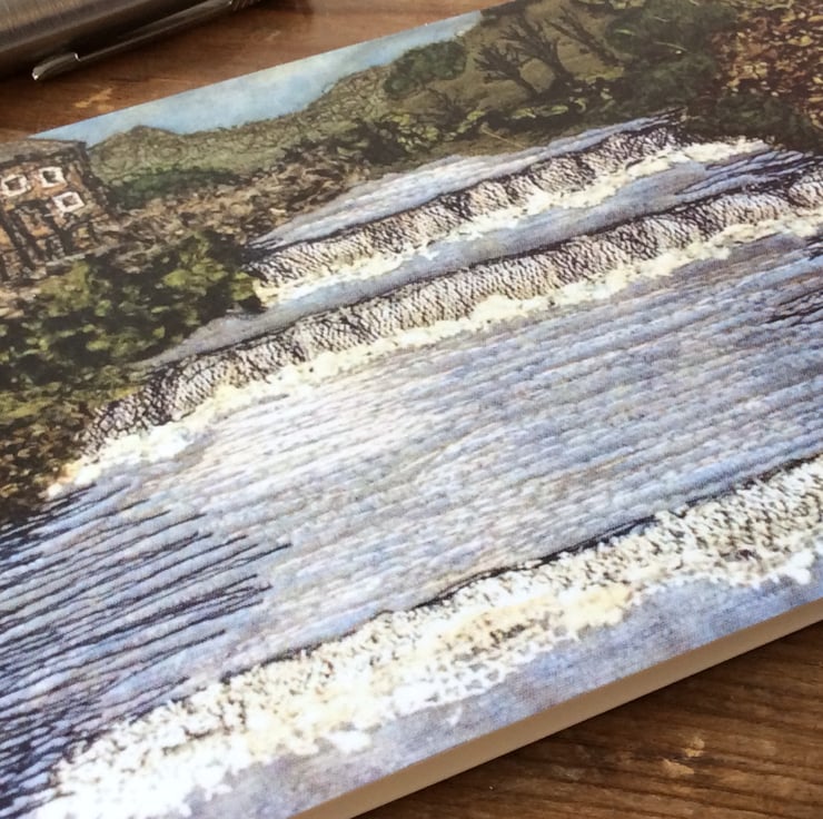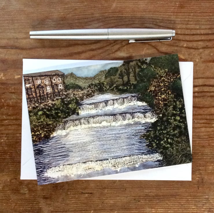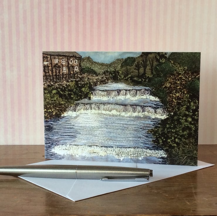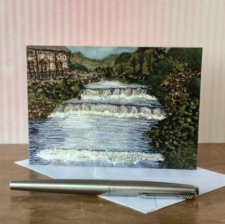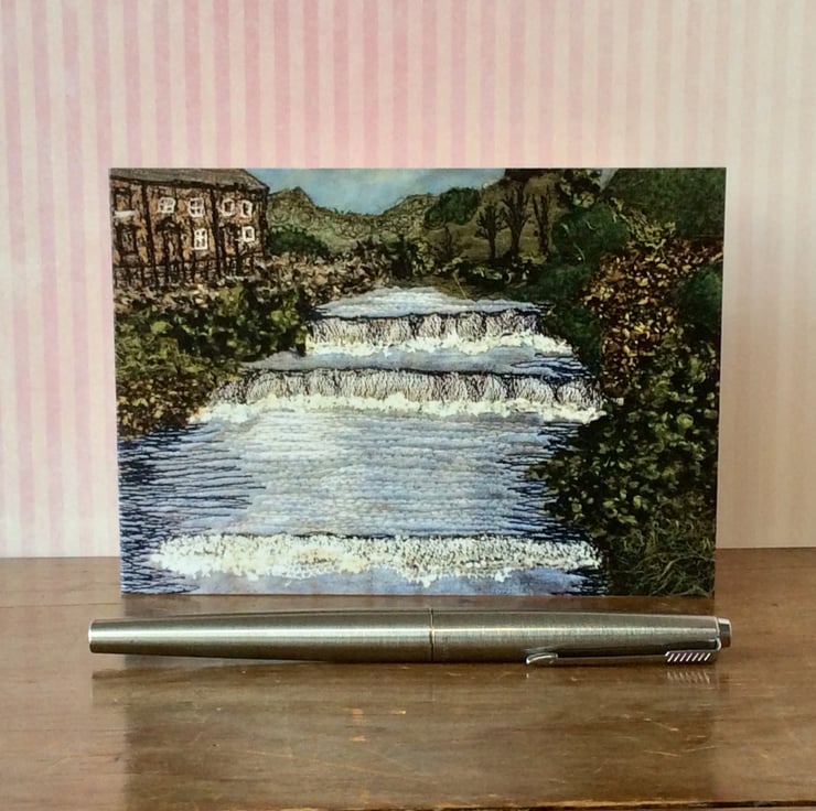 This card is a print of one of my free motion embroiderd landscapes of Yorkshire. It shows the waterfall at Gayle Beck (Hawes, Yorkshire Dales), with bushes to the right and Yorkshire stone houses to the left. Ideal for any occassion. The card measures 14.8 x 10.5cm and it comes with a cream envelop in a plastic cover for protection.