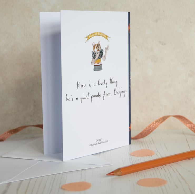 The card is blank inside for your own personal message. The back of the card features a little rhyme about Kevin. It reads: "Kevin is a lovely thing. He's a giant Panda from Beijing."