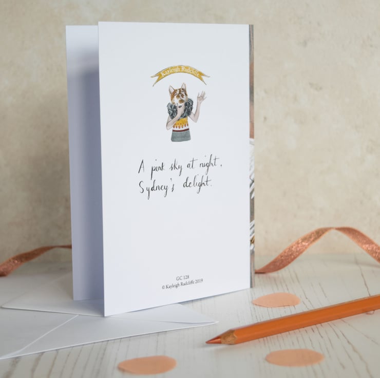The card is blank inside to let you add your own personal message. The back of the card features a little rhyme. It reads: "A pink sky at night, Sydney's delight."