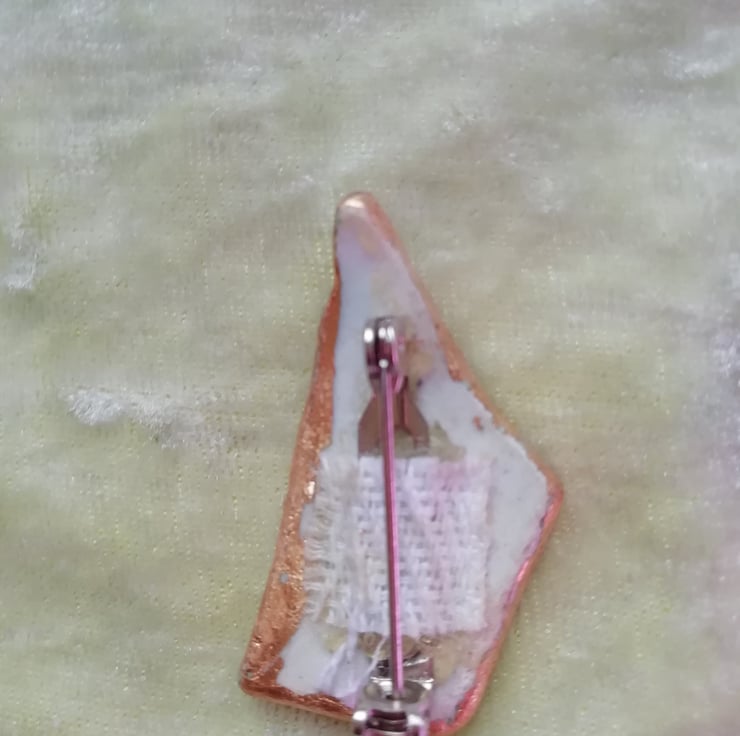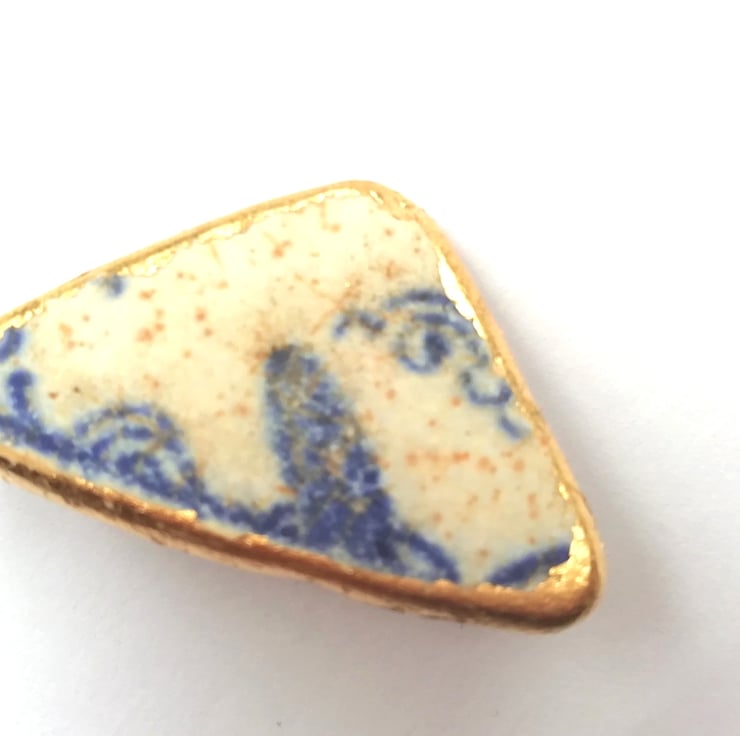 This little piece of sea smoothed pottery is gilded at the edges with gold leaf. It has a brooch pin. Size 4cm by 2.4cm.. Found on the Kent shores and up cycled into a pretty brooch. The pin is securely attached with resin.