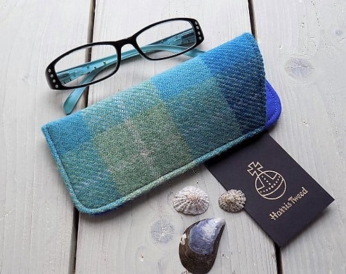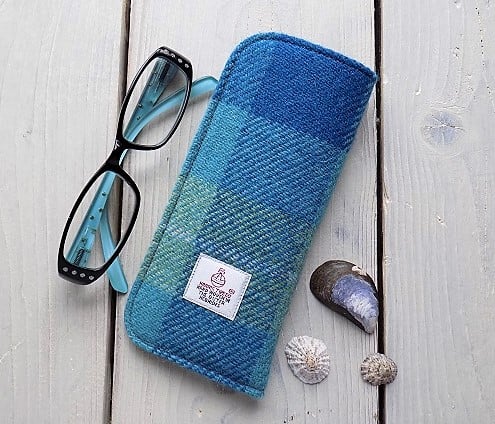 Generously proportioned Harris Tweed glasses case: tartan weave in various shades of turquoise.