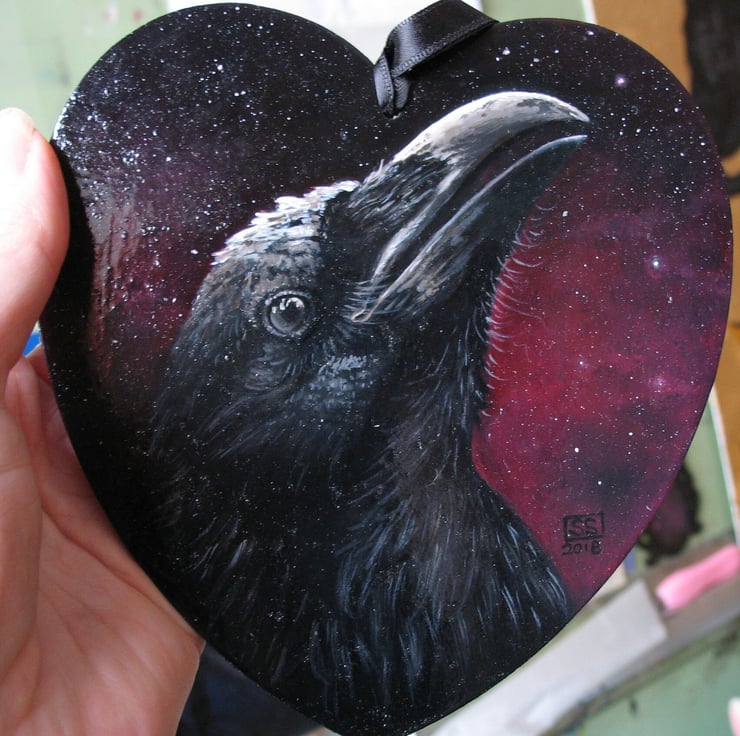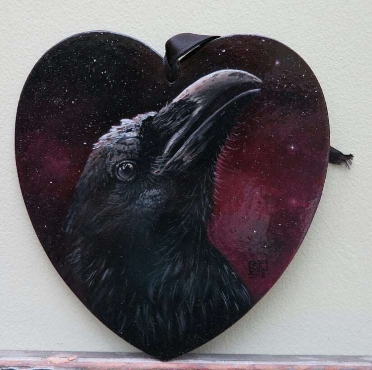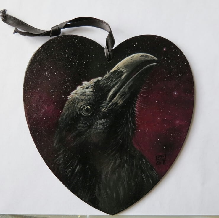 This celestial night sky black raven is painted in oils on a sweet heart-shaped mdf panel with black ribbon hanger. It measures approximately 13.5cm wide and 15cm high and has been varnished with gloss varnish. This is very eye-catching and ready to hang!