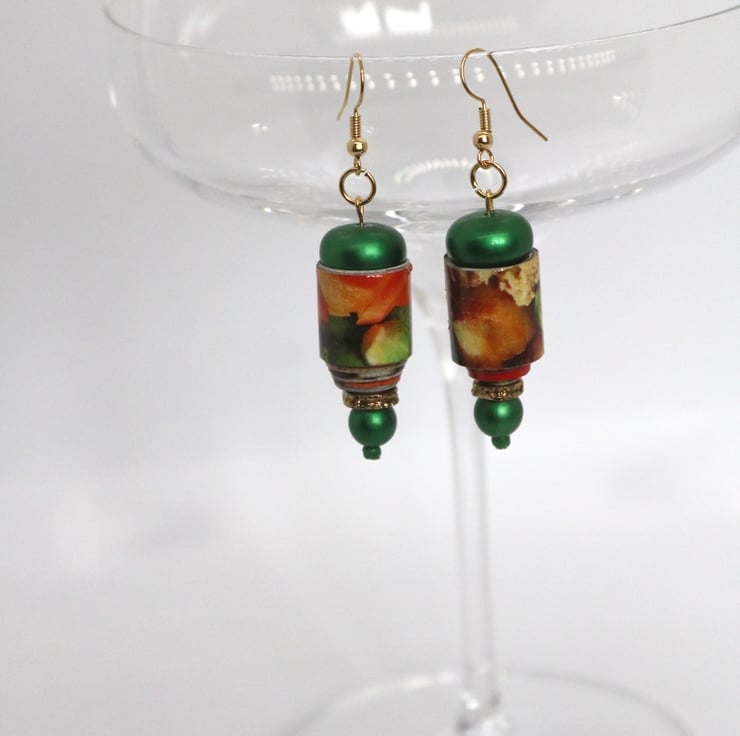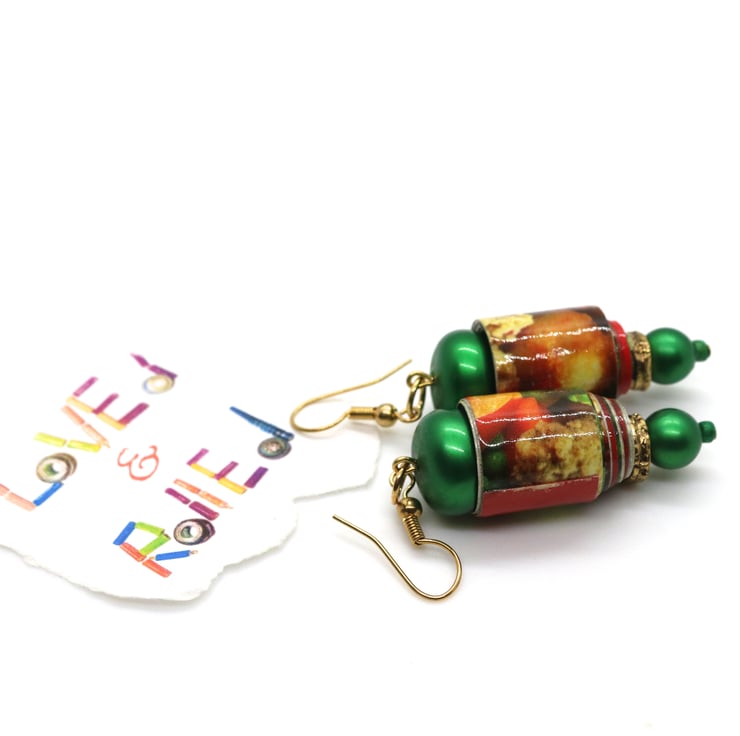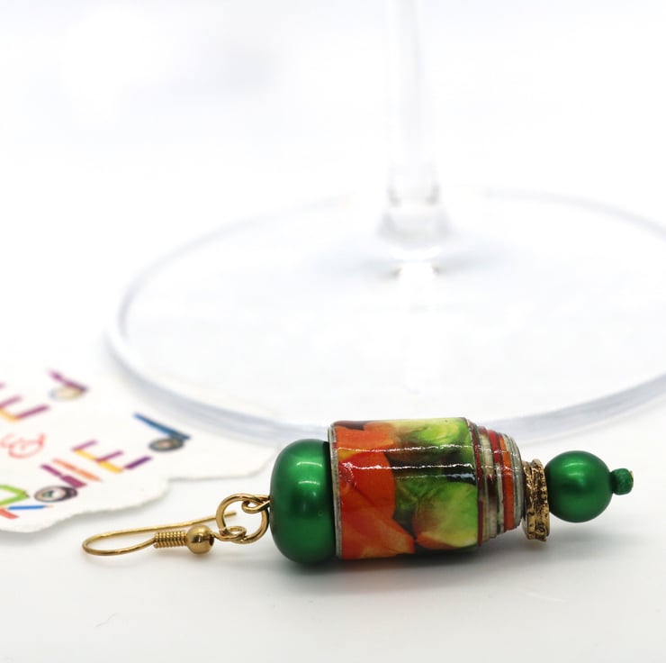 A pair of vibrantly coloured earrings made of large cylindrical paper beads, complemented with green pre-loved beads. Mounted on gold plated earrings hooks.