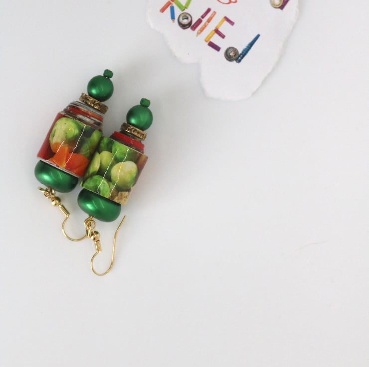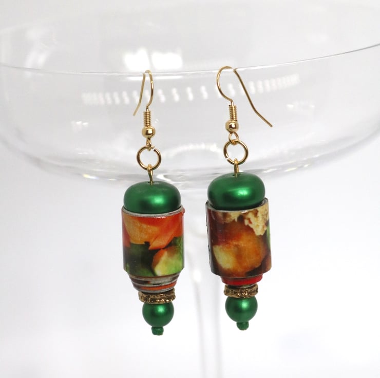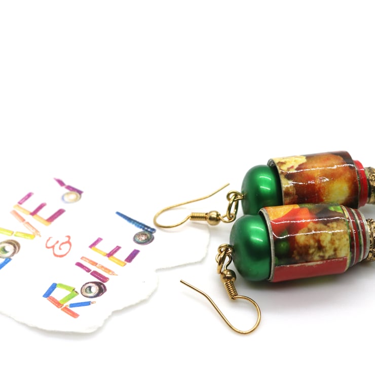 The Crisis flyer this year had a photo of a Christmas meal. Its colours were so vibrant that I could not resist making paper beads out of it. If you look carefully at the earrings, you might recognise carrots, brussel sprouts, cauliflower and even roast potatoes!