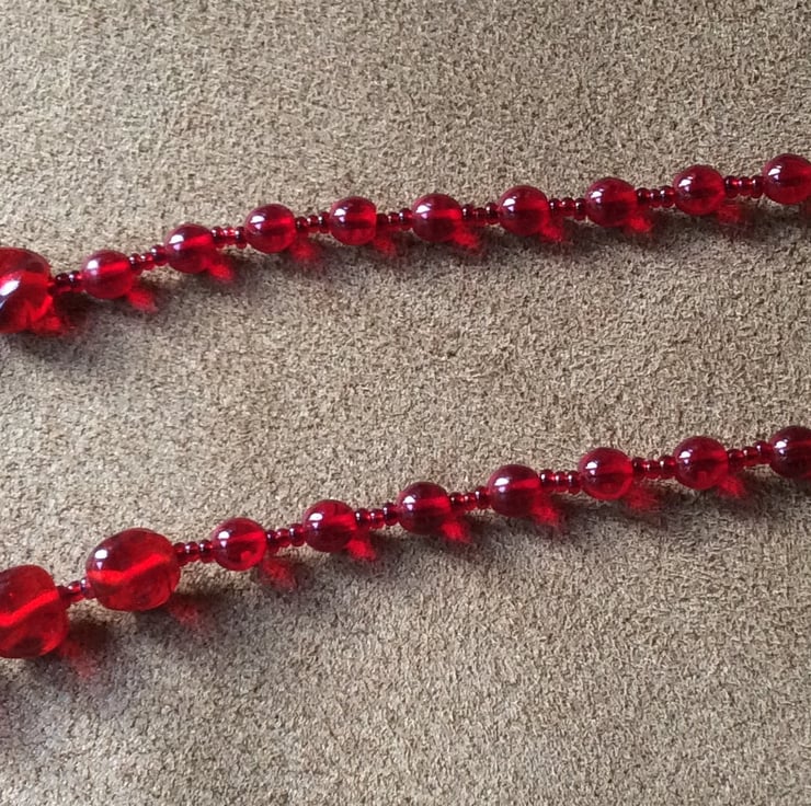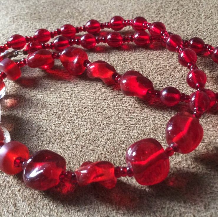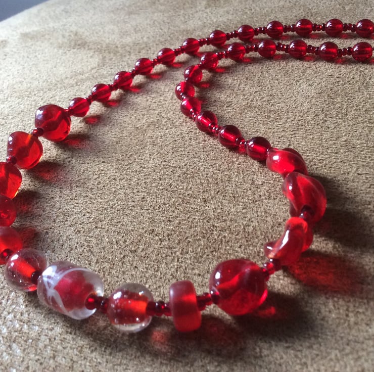 Made using various shape and sizes red glass beads. Finished off with silver plated clasp.