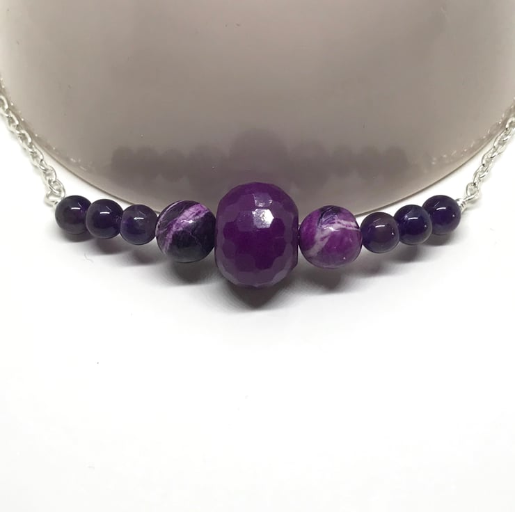 I have created this necklace using a selection of beautiful gemstone beads, a large statement faceted purple quartzite in the centre, purple jasper at either side and 3 amethyst beads at both ends. The beads are graduated in size of 16 x 12 mm Quartzite rondelle in the center 8mm Purple Jasper and 4mm Amethyst beads. I threaded the beads onto silver filled wire which I shaped into a curve and finished with wrapped loops. The curved bar is attached to a silver plated chain and also has an extension chain to adjust the length.