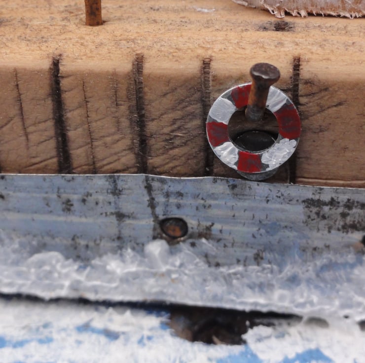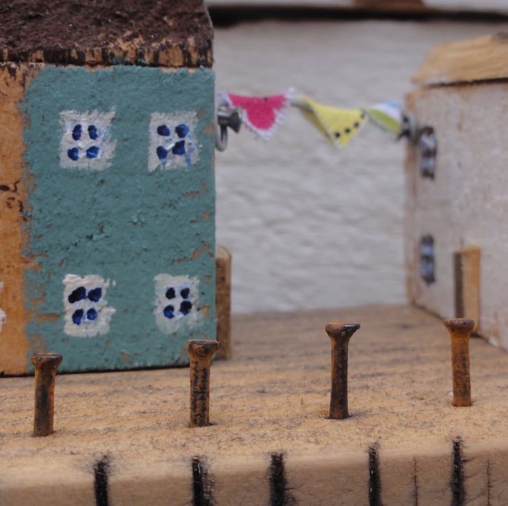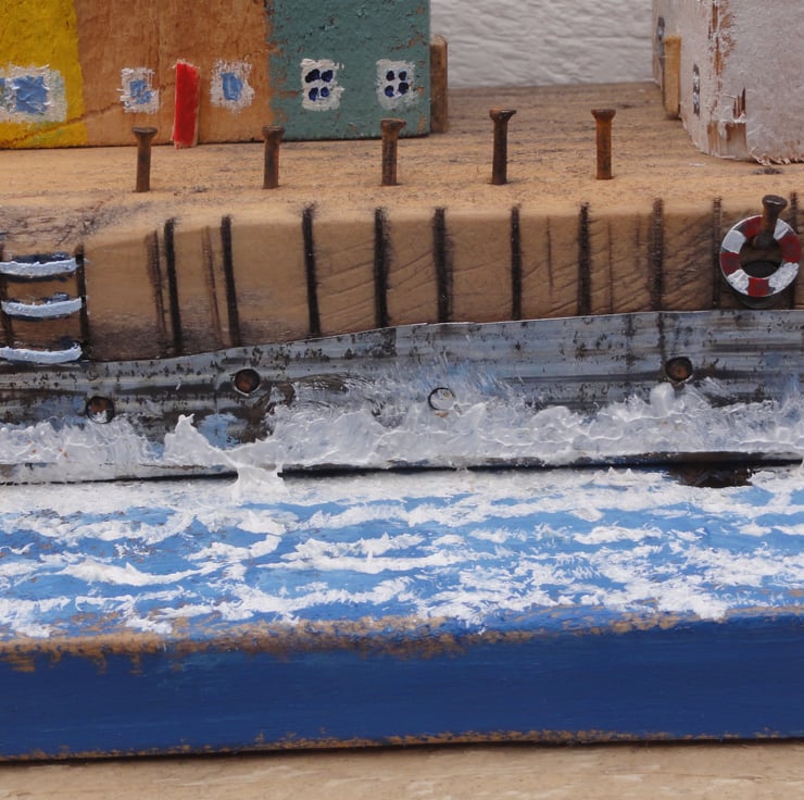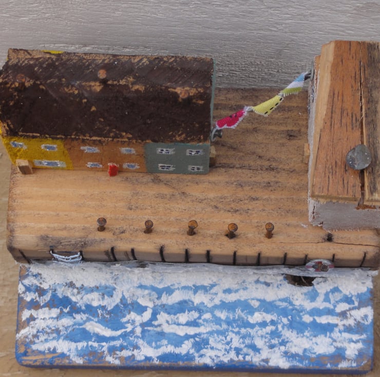 Made from reclaimed materials, this little scene shows hand-painted houses overlooking the sea. The base and houses are made from pallet wood and feature tin can sea defences and tiny bunting made from off cuts of fabric.