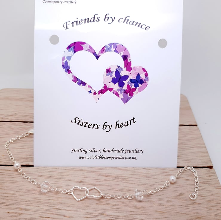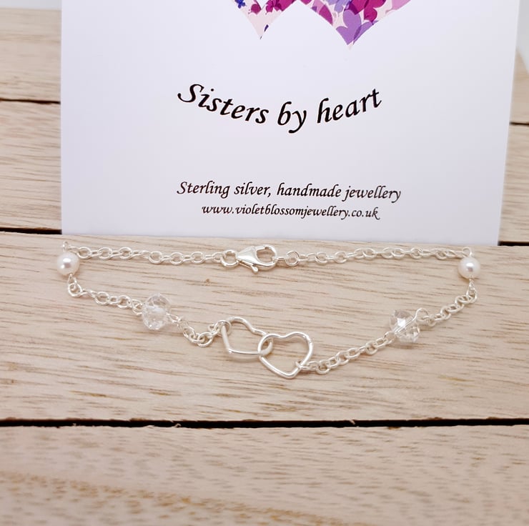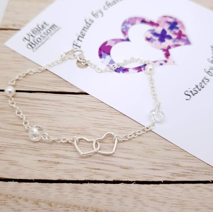 This sterling silver heart bracelet is made with two interlinked hearts that cannot be separated representing the bond between two hearts. The interlinked hearts are complimented by Swarovski crystals and pearls adding pretty sparkle and lustre when the light catches the crystals.