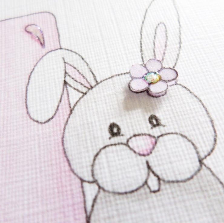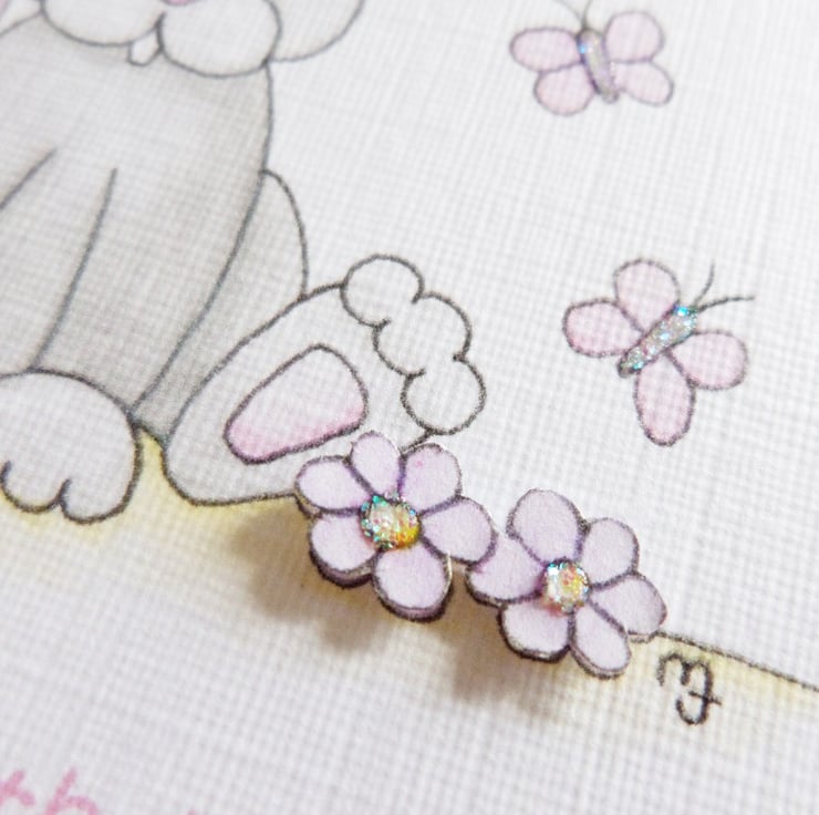 This cute 1st Birthday card has been designed using my own original watercolour illustration. The image has been printed out onto good quality card and embellished with glitter detail on the no.1 and butterflies. The little decoupaged flowers have been cut out by hand and finished off with A little glitter detail.