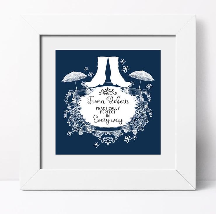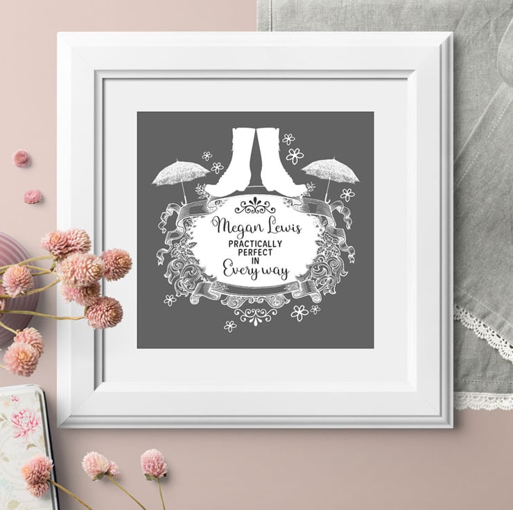 Practically Perfect Personalised Print – a fabulous present for the perfect person in your life! This pretty print is a lovely gift idea for her and will certainly raise a smile. Ideal for all ages and wonderful for a birthday, newborn baby, or Mother’s Day. The print is personalised with any name of your choice, and features those fetching Poppins-esque lace up boots and parasol.