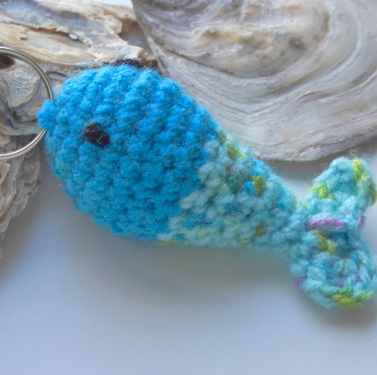 A cute blue and speckled fish keyring that has been hand crocheted. This would make a fun gift for anyone who likes fish, angling or keeps fish