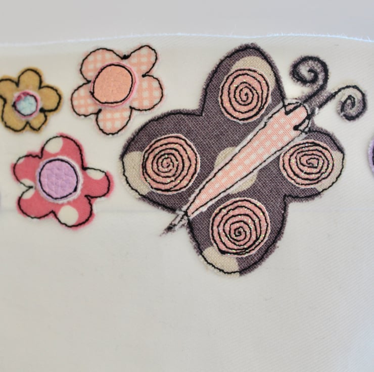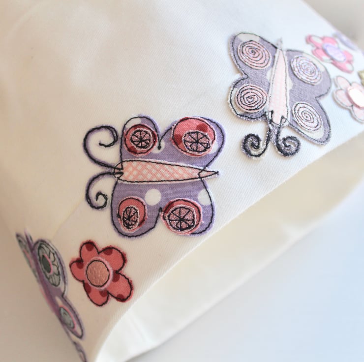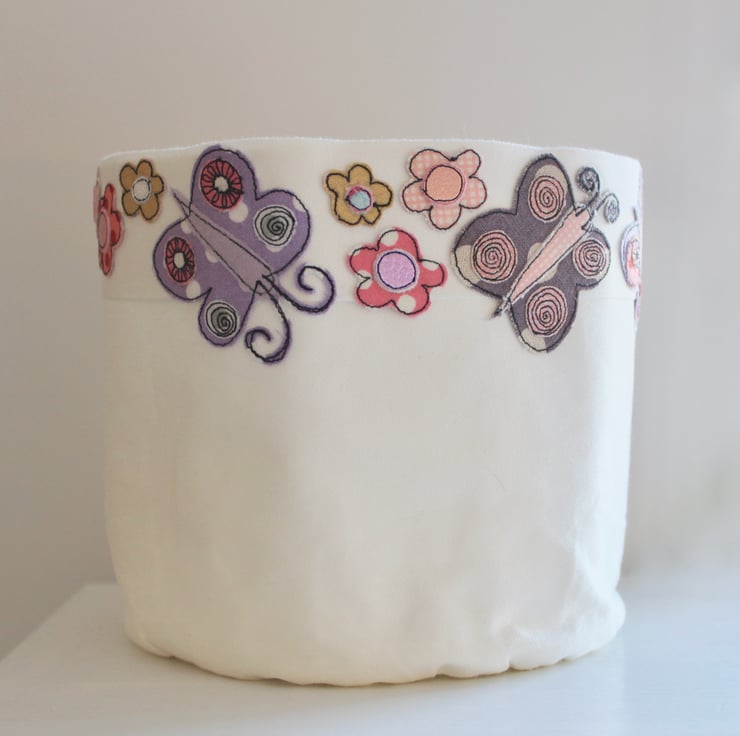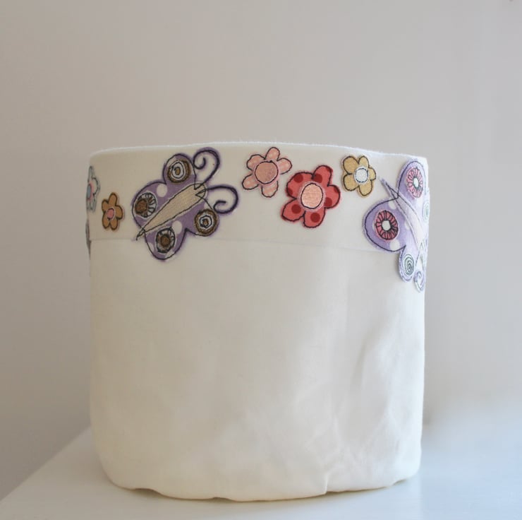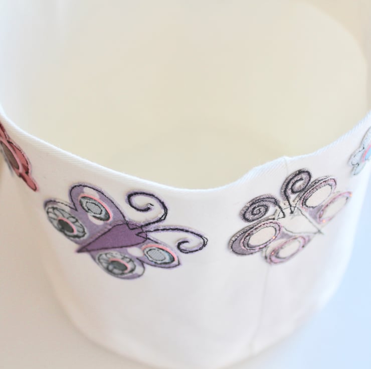 Fabric bucket is unstructured and lined in cotton cloth with free hand machine embroidered, multilayered butterflies and flowers around the collar.
