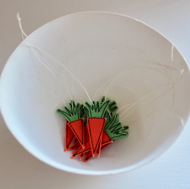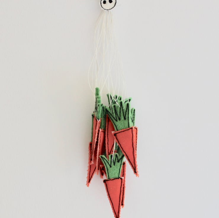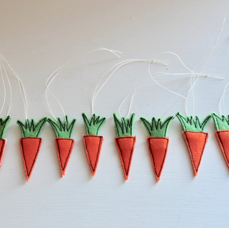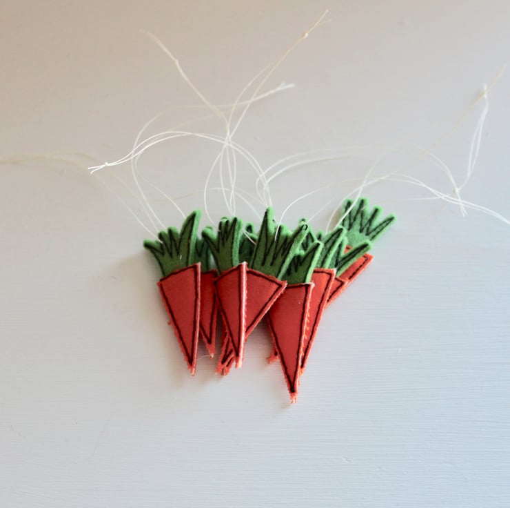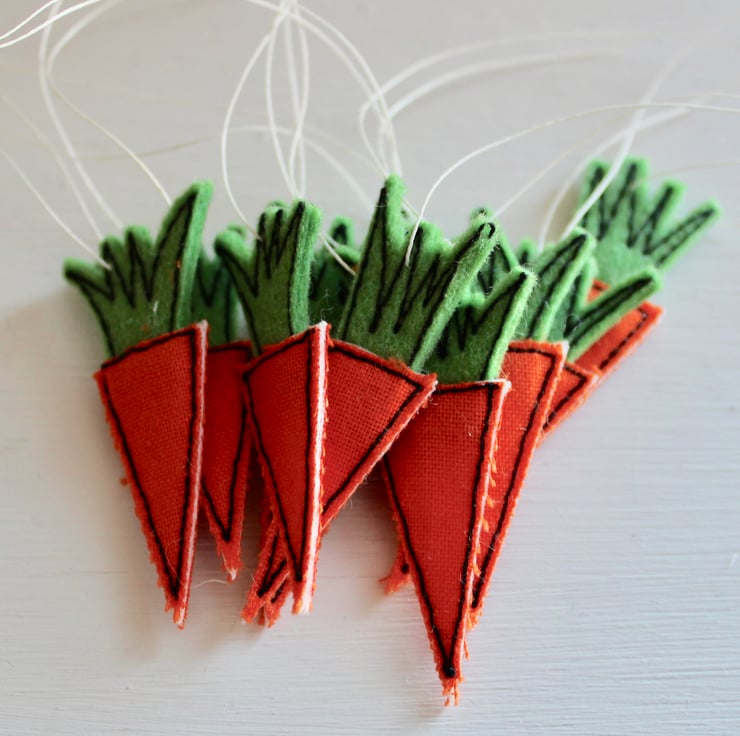Ten little carrots are handmade using cotton cloth, 100% wool felt and free hand machine embroidery. Multiple layers of cloth are sewn together and then each part of the design is cut out by hand. There is a linen thread to hang each carrot.