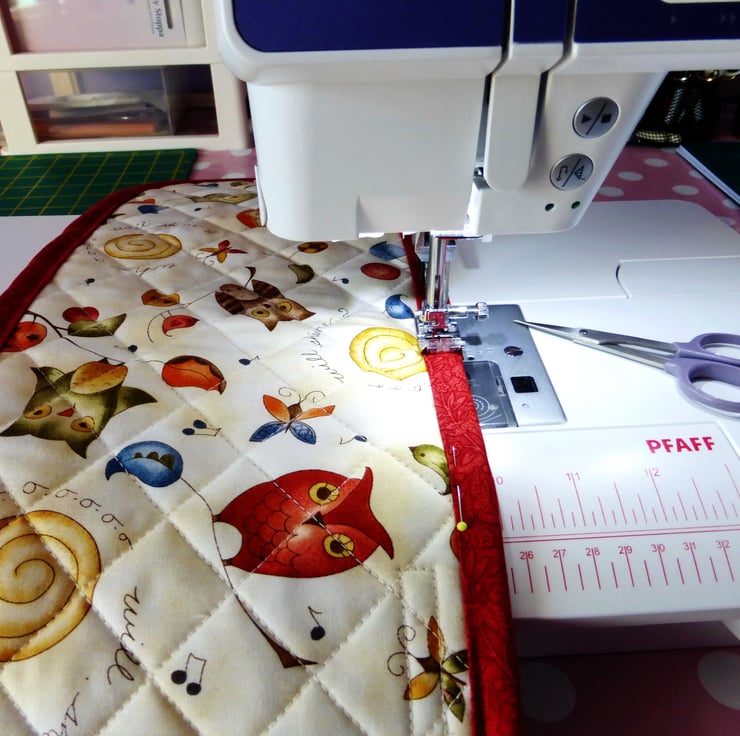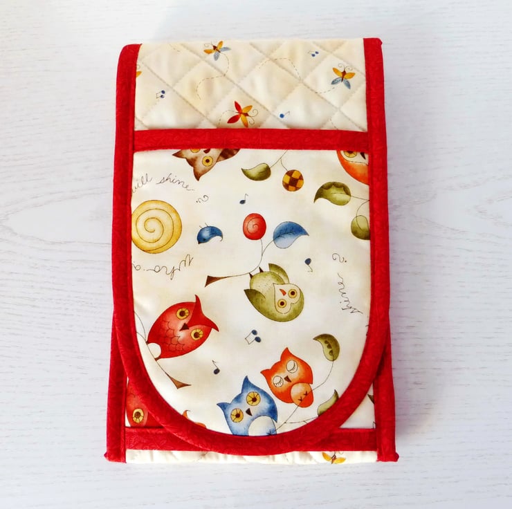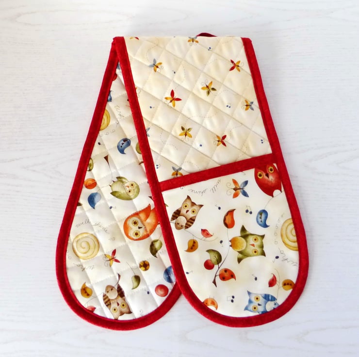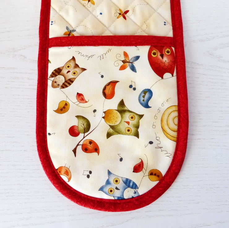 These oven gloves have been made using a lovely quilting cotton fabric with an owl design, and a matching cotton fabric with a small butterfly design. The background is a soft cream colour, the owls and butterflies are in subtle shades of red, green and blue.