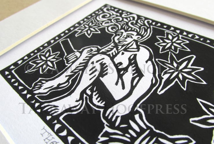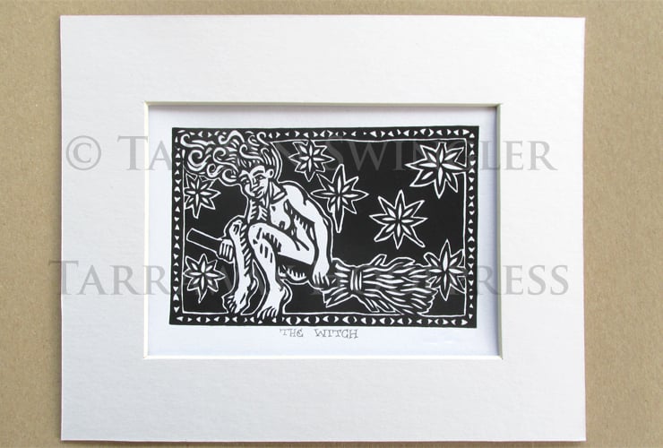 Inspired by the old woodcuts depicted the shenanigans of the sorts of witches found in old chapbooks, this print is available in traditional line, with a black fill and elsewhere in the shop, in fill colour and kinda looks like a piece of marginalia. Surrounded by many eyes, possibly of spirits, familiars or supernatural agents. This was great fun to do, and is fairly dinky but striking.