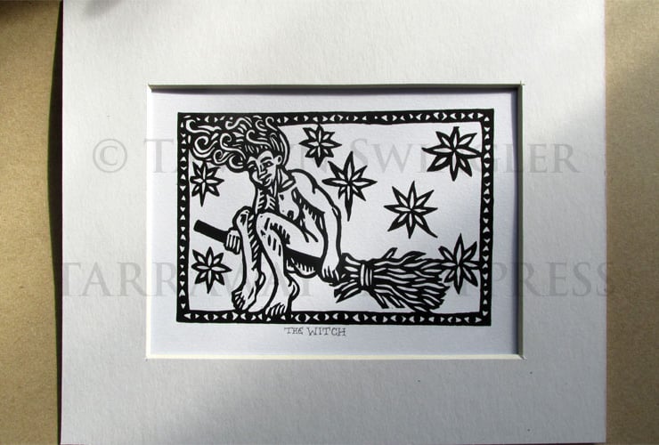 Inspired by the old woodcuts depicted the shenanigans of the sorts of witches found in old chapbooks, this print is available in traditional line, with a black fill and elsewhere in the shop, in fill colour and kinda looks like a piece of marginalia. Surrounded by many eyes, possibly of spirits, familiars or supernatural agents. This was great fun to do, and is fairly dinky but striking.