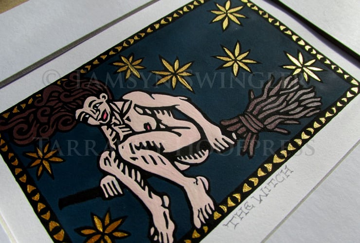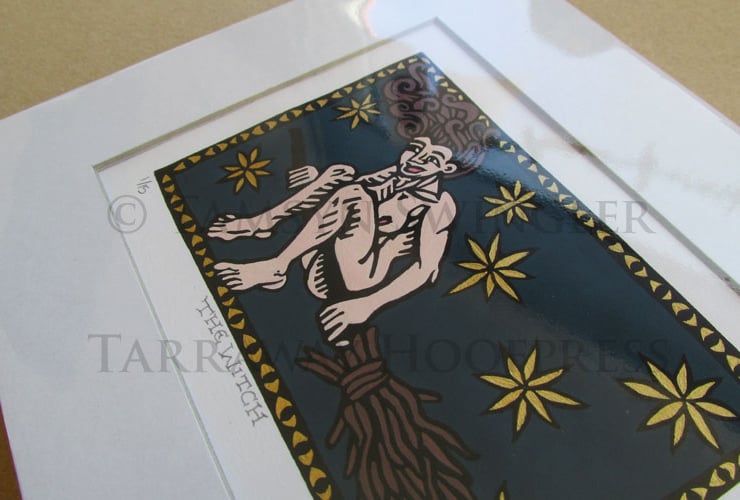 The Witch - Full Colour Lino Print - Hand Coloured - Gold -