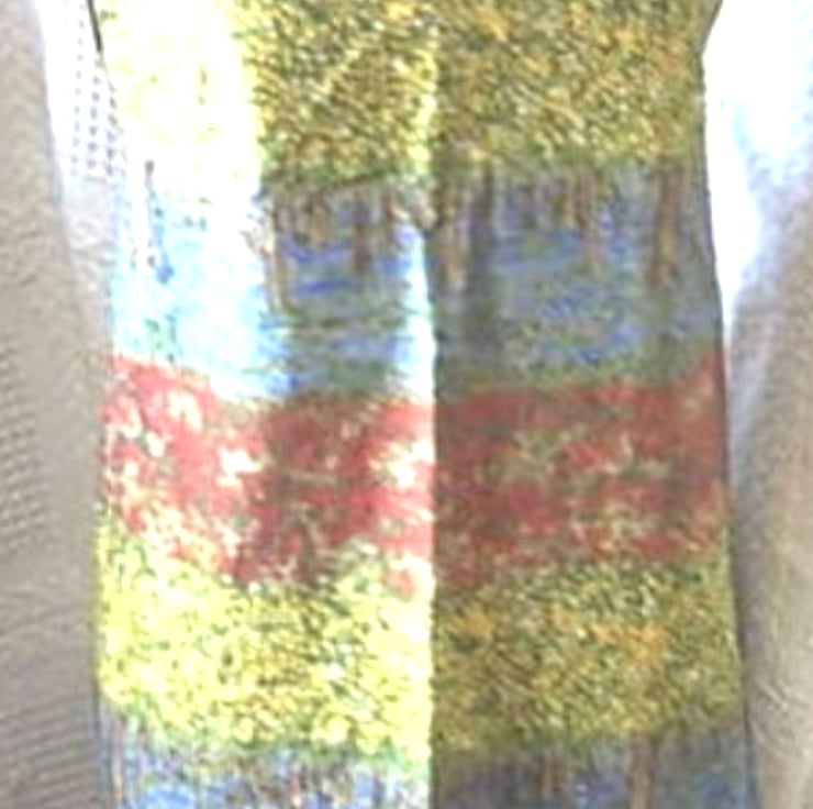 In the bluebell woods in Spring adult apron with rows of bluebells, daffodils and pretty red flowers in among the trees. A very bright colourful design , with back ties , washable cotton fabric .