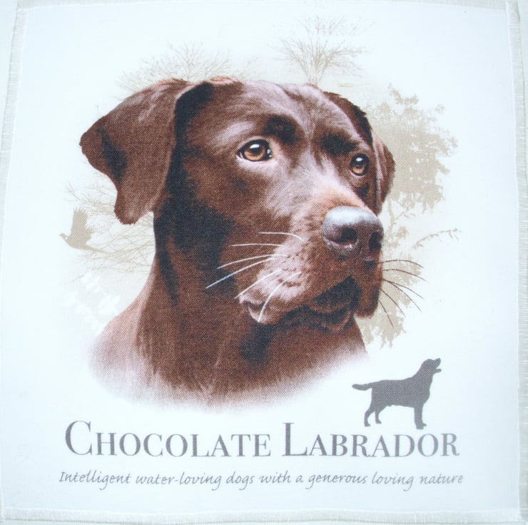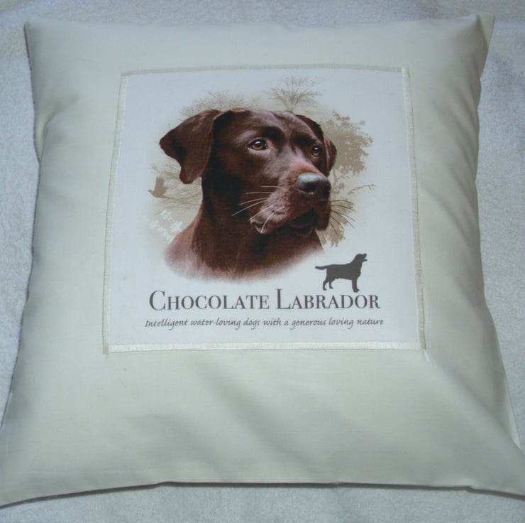 Chocolate Labrador portrait cushion with a lovely labrador and description under the dog