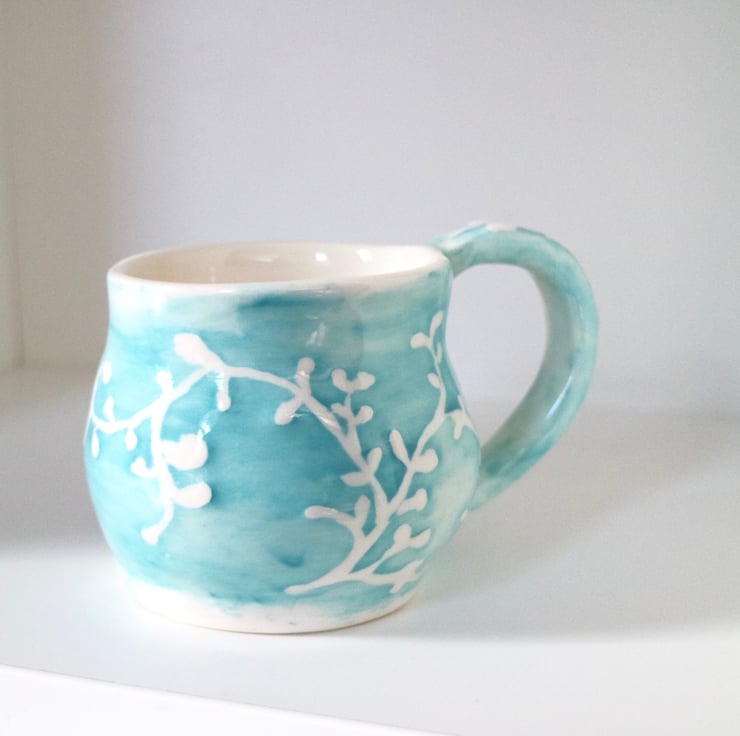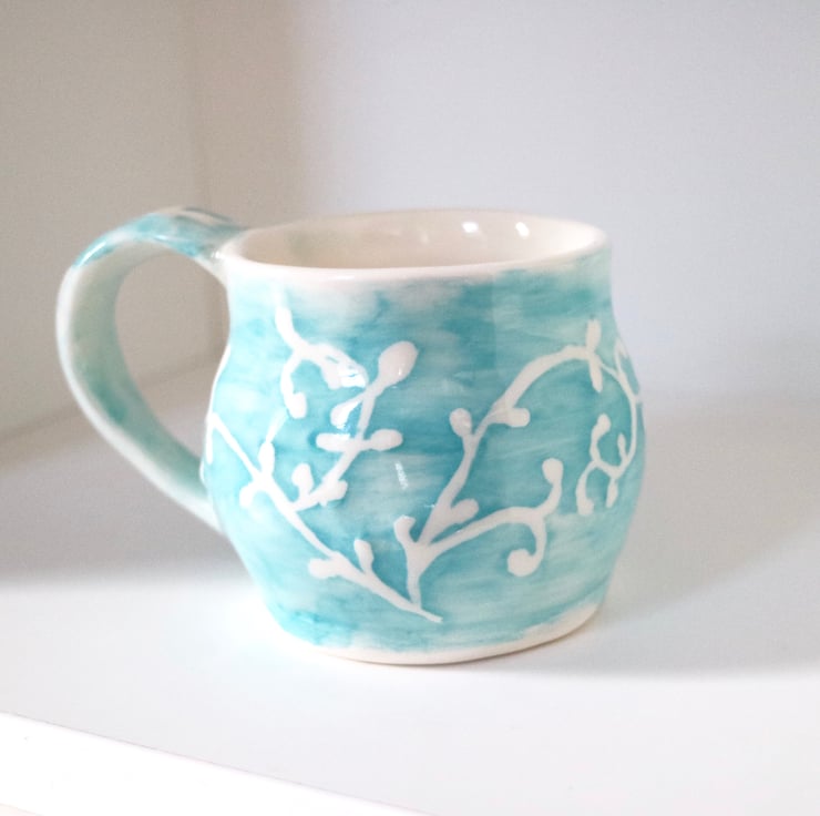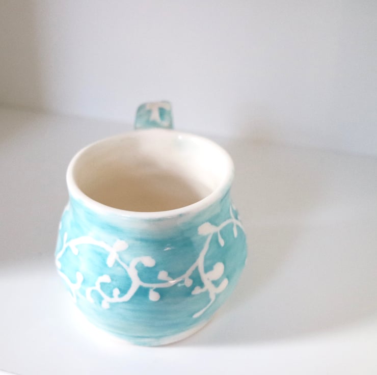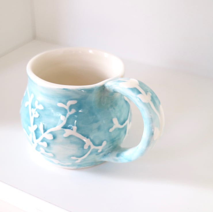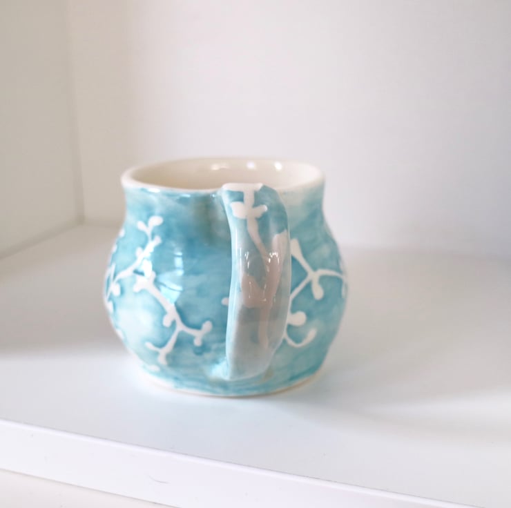 A watercolour blue porcelain expresso cup hand thrown and decorated with a relief tracery design. Glossy finish with a creamy white inside and a fresh blue and white design on the outside.