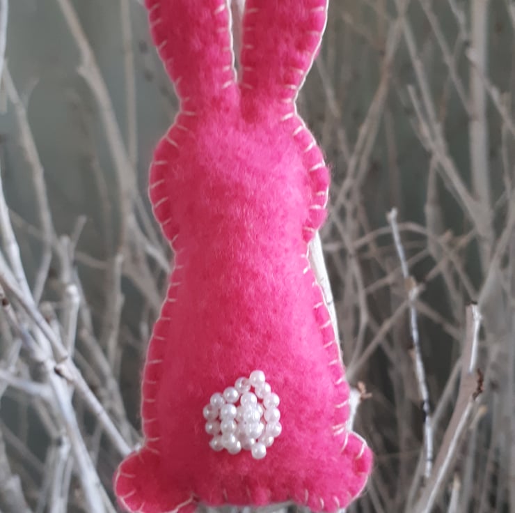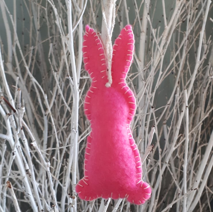 The bunny rabbit measures 4" x 1 1/2" and is attached to a 2" hanging cord.