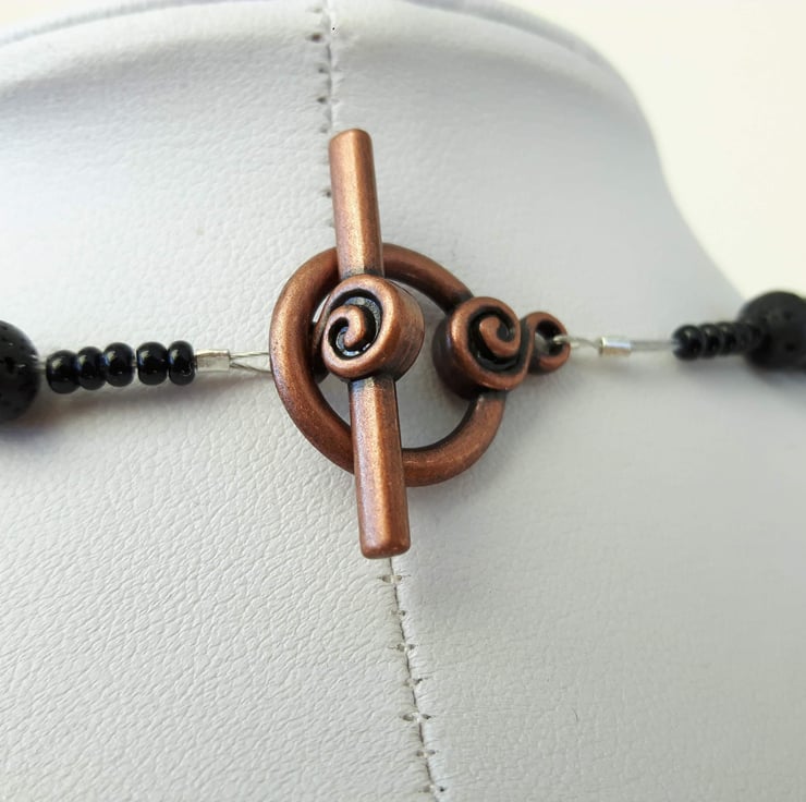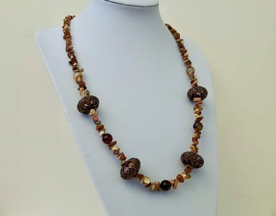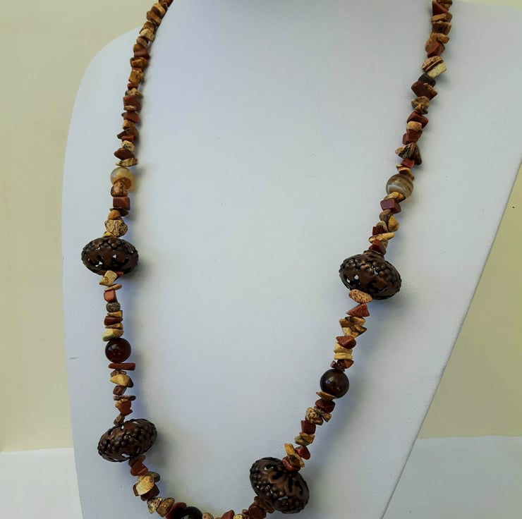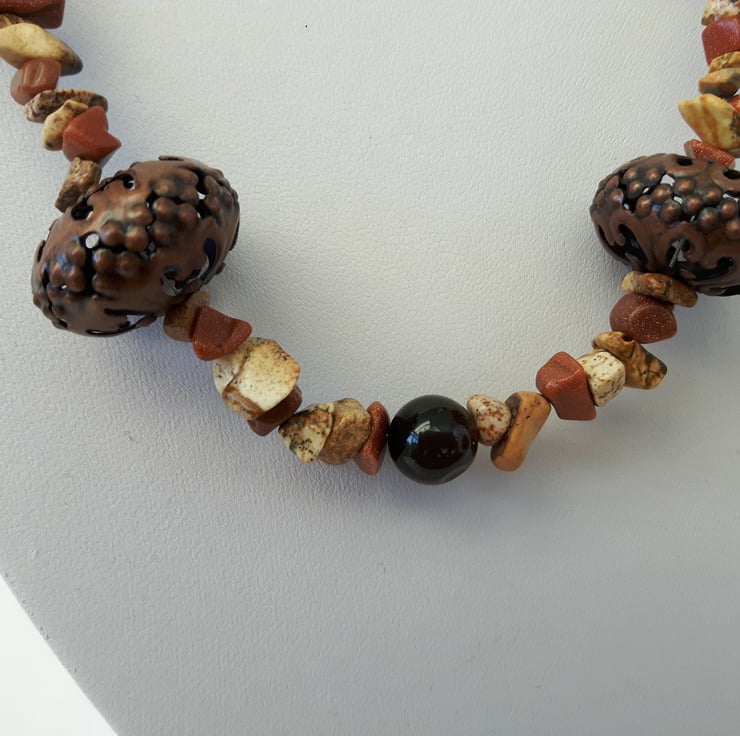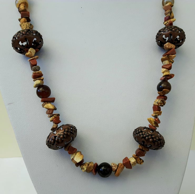 This richly coloured autumnal necklace features a mixture of gemstones: nuggets of picture Jasper and brown goldstone together with round beads of black lava rock and Botswana Agate. These are highlighted by four large coppertone beads in a filigree design which represents trees laden with fruit. The Tibetan bar and ring clasp is also in a coppertone finish. This is a fairly long necklace - about 28 inches or 72cm - and looks great over a dress or T-shirt.