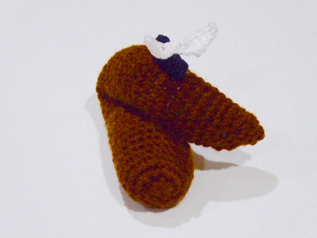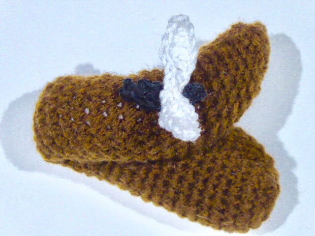 Made from brown acrylic yarn with a fly made of cotton, it's a vegan friendly poo too.
