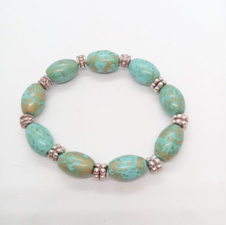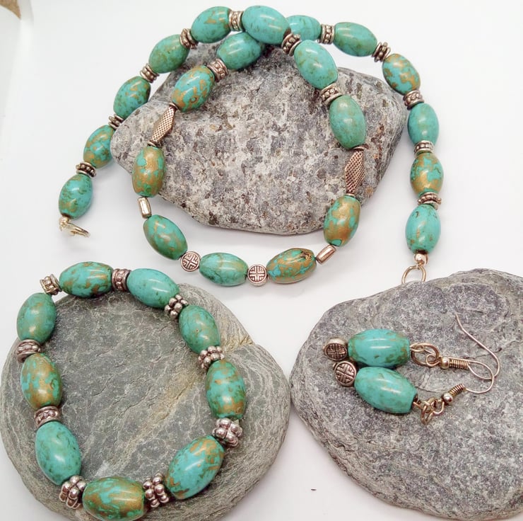 This stunning jewellery set is made using 18 x 10 mm Turquoise barrel beads with an assortment of silver plated spacer beads. The earrings have silver plated fish hook ear wires, the necklace has a silver plated lobster clasp and the bracelet is threaded onto jewellers elastic.