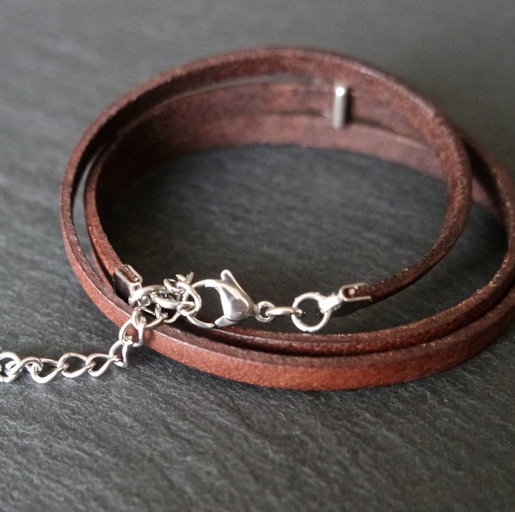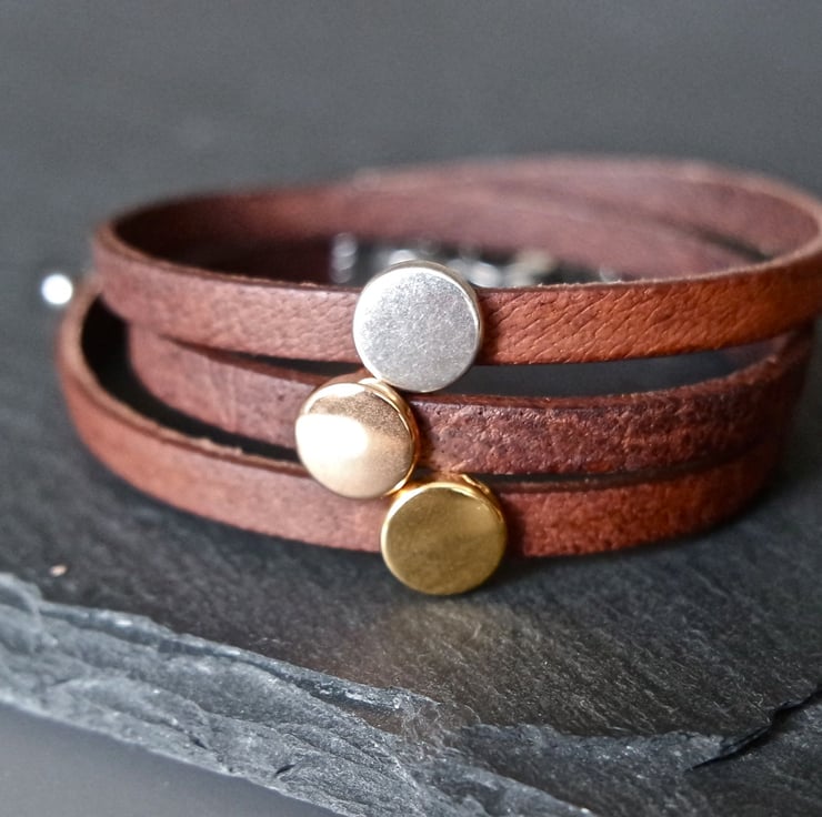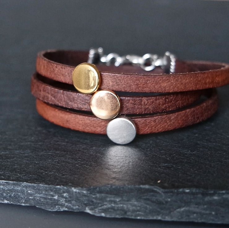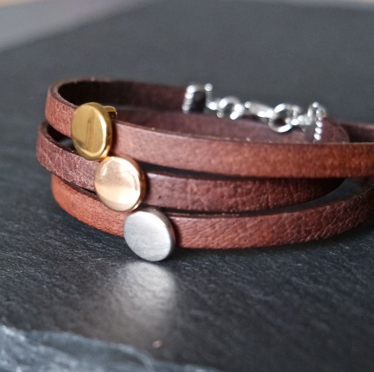 A really lovely leather bracelet in dark brown with 3 slider beads in gold, rose gold and silver.