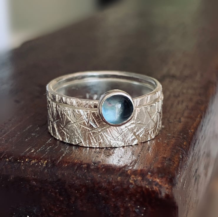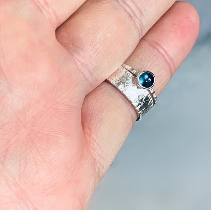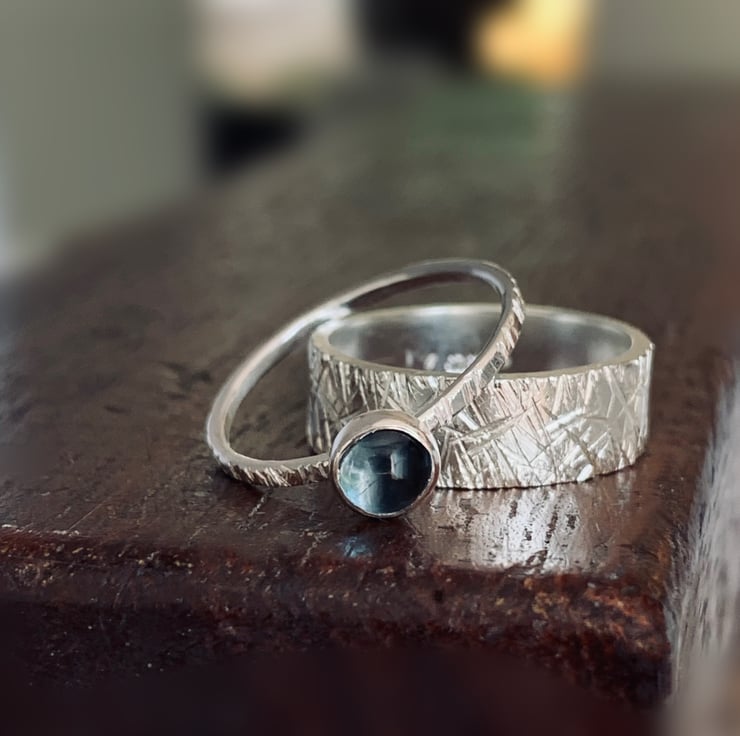 London Blue Topaz 4 mm cabochon set into sterling silver scratch textured 1 .5 mm ring