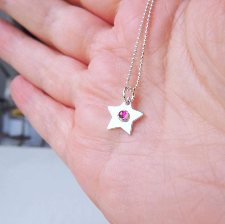 A Birthstone Necklace makes a special and thoughtful gift for a July birthstone and this star necklace is sure to appeal to all ages. Made from Sterling Silver, the star has a Lab Ruby set into its centre. Lab Rubies have the same structure as a genuine ruby but is created in a lab rather than a rock.