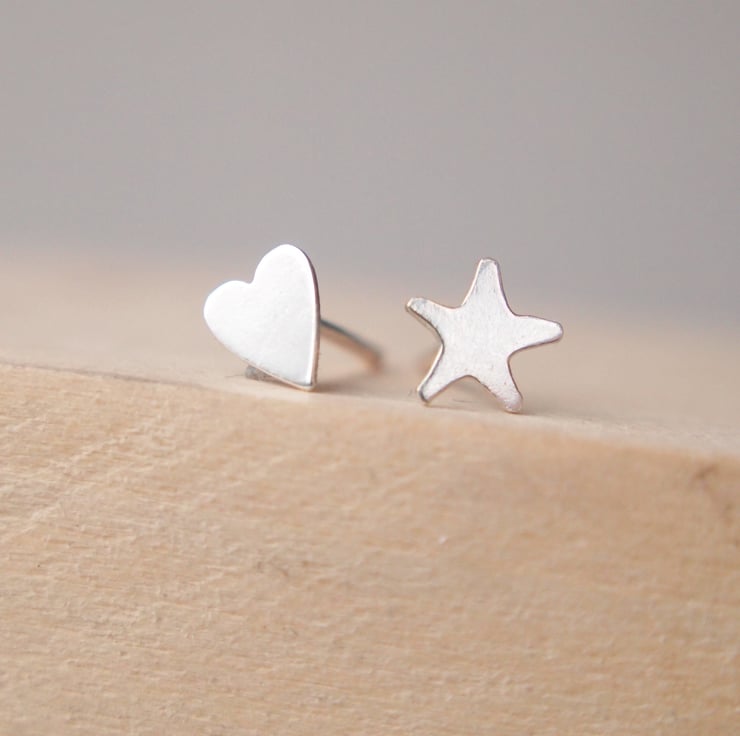 A pair of mismatched studs featuring a star and a heart. These a very small stud earrings, perfect sized for everyday wear and also suitable for second and third piercings as well as cartilage piercings.