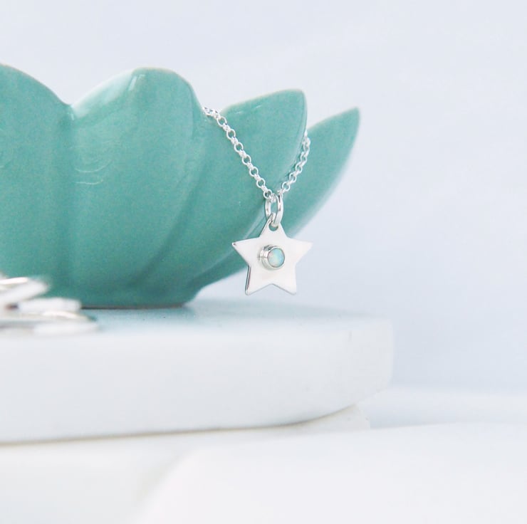 A beautifully simple sterling silver star with an iridescent Opal in its centre. The stone is a reconstructed Opal so it has all the beauty of a real stone but the cost is more affordable.