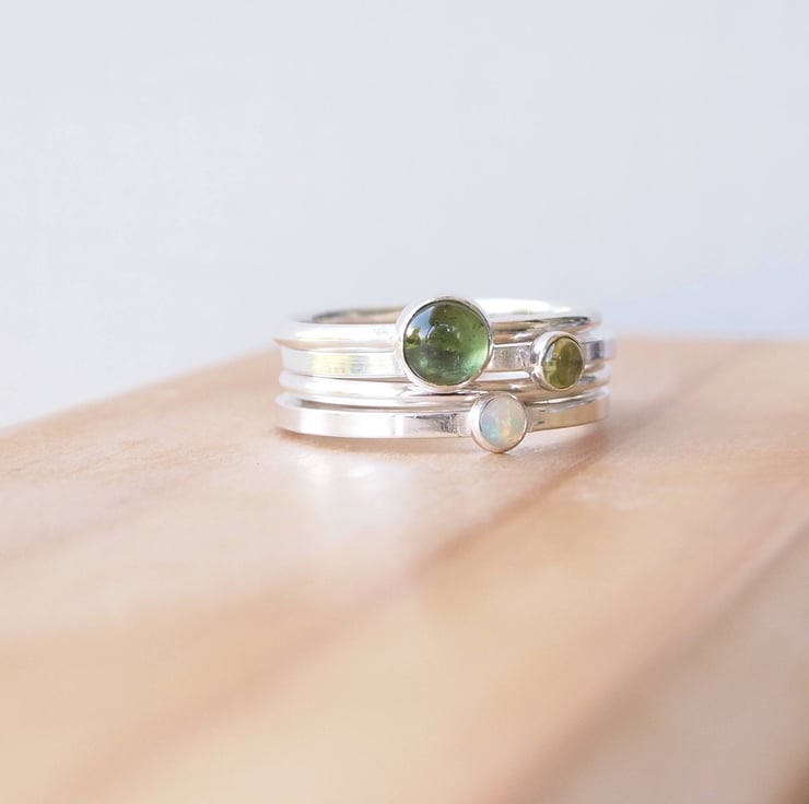 Green Tourmaline and Sterling Silver gemstone ring. A Green Tourmaline cabochon, set onto a band of Sterling Silver to create a beautifully simple ring. Tourmaline is the alternative birthstone for Oct - perfect for those who want a change from October's usual stone Opal.