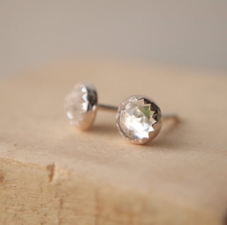 Sterling Silver and cleat white Topaz Stud Earrings. A pair of facet cut white Topaz set by hand into Sterling Silver mounts. The gemstones a clear with the facet cut creating a brilliant sparkle. White Topaz is used as an alternative April birthstone to diamond - they are similar in colour and style, have plenty of sparkles but are a lot less expensive!