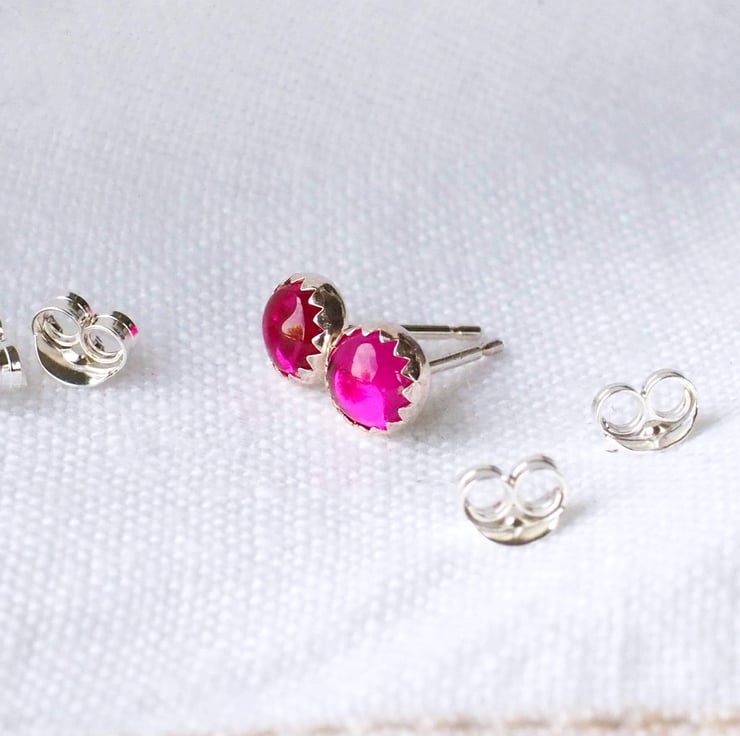 Lab Ruby Gemstone Earrings. Hot pink lab Rubies set into a surround of Sterling Silver. the gemstone mount has a serrated zigzag edge to contrast against the smooth surface of the round cabochon stone.