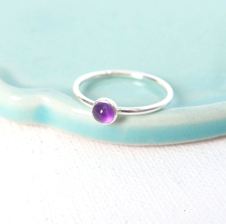 Silver and Amethyst Ring. A 5mm Genuine Amethyst set onto a band of Sterling Silver. The stone is cabochon cut and is a deep purple. Amethyst is February's birthstone so this makes a perfect gift for February birthdays.