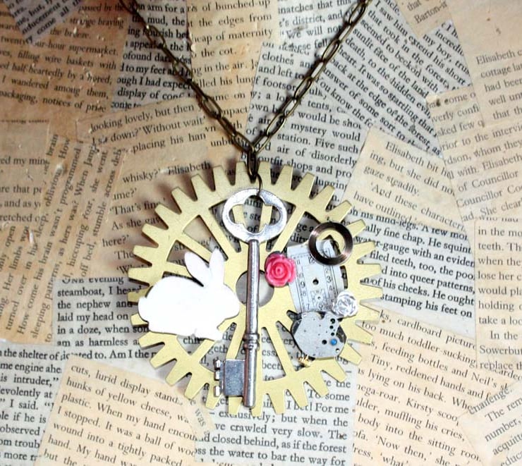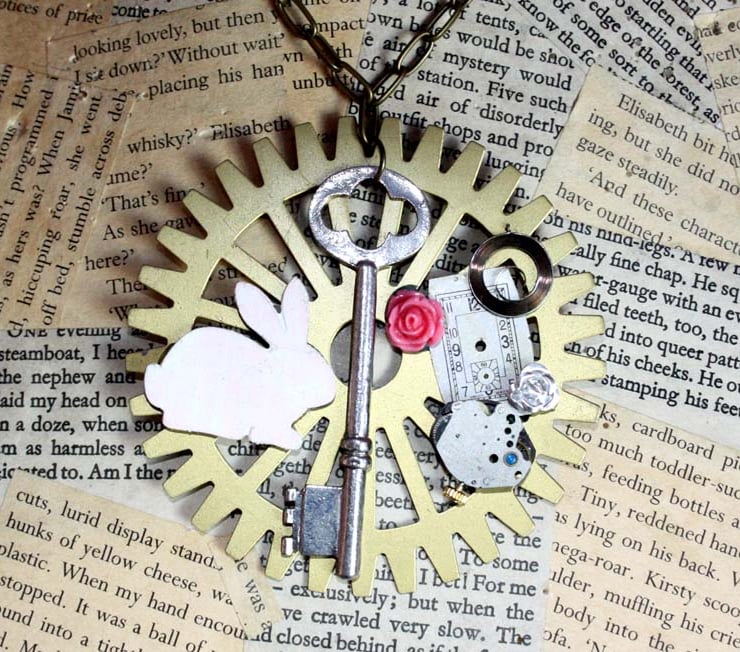 This statement necklace features a giant antique gold tone metal cog, over which sits a large silver tone key. The cog has been adorned with a wooden white rabbit, roses and vintage watch parts to create an Alice in Wonderland inspired necklace.