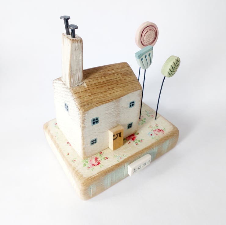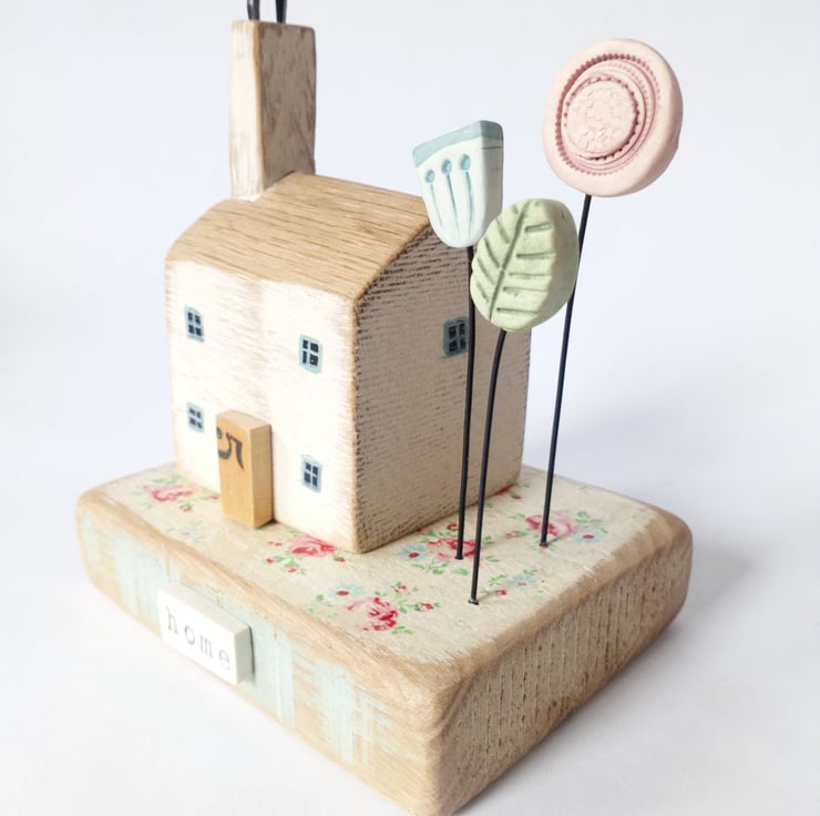This is one of my hand carved and painted little rustic oak cottages, adorned with my favourite things - flowers, hearts and bird