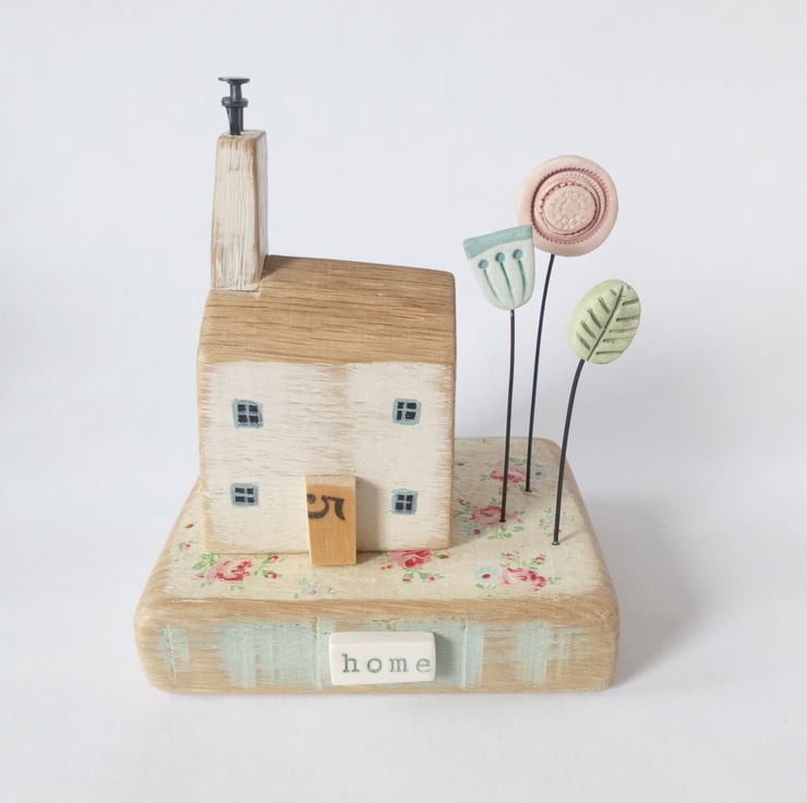 A delicately made free standing piece in muted tones for a mantle or shelf, this cosy little house is looking for a home.