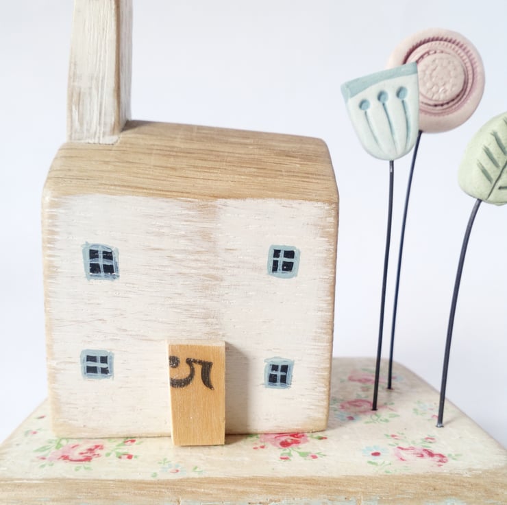 This hand made and painted oak wood house with a jaunty chimney has two clay flowers and a leaf growing in the garden!