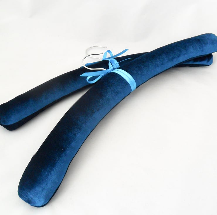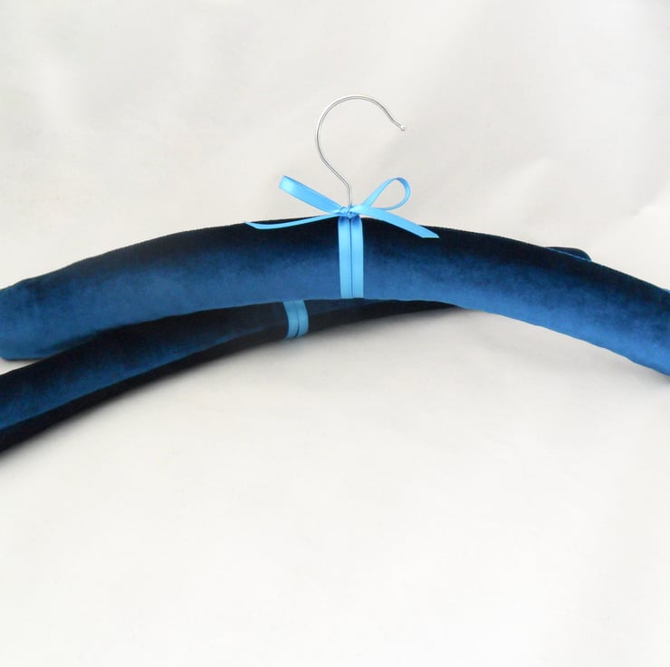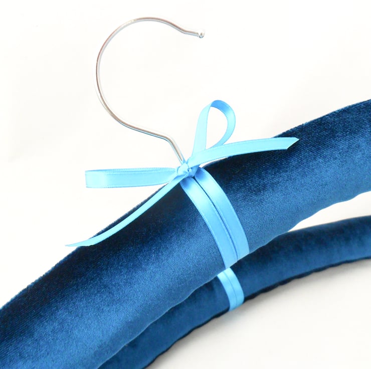 A pair of teal padded coat hangers, handmade in soft velvet and trimmed with a turquoise satin bow. The thick padding means they are perfect to use with your most delicate clothes as there are no hard edges to catch the fabric or to leave marks. Use in the wardrobe or display your favourite dress on the back of the door. A great Mother's Day gift!