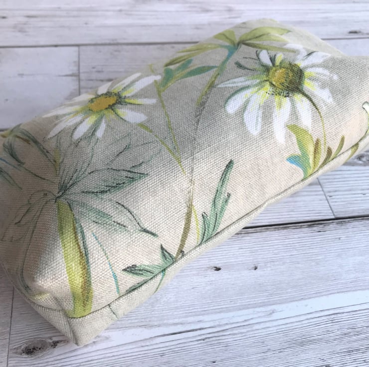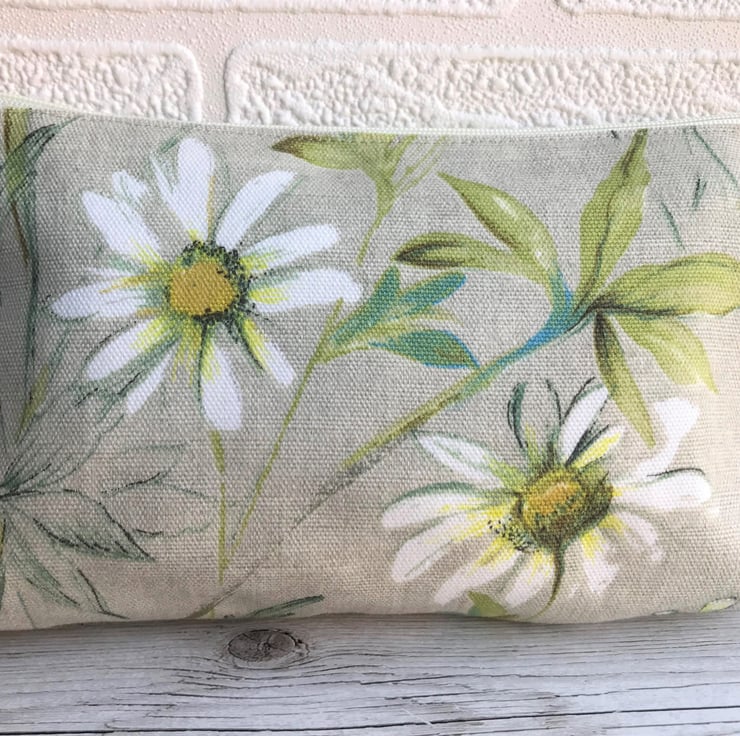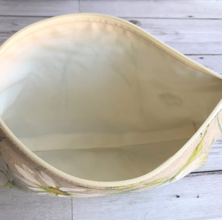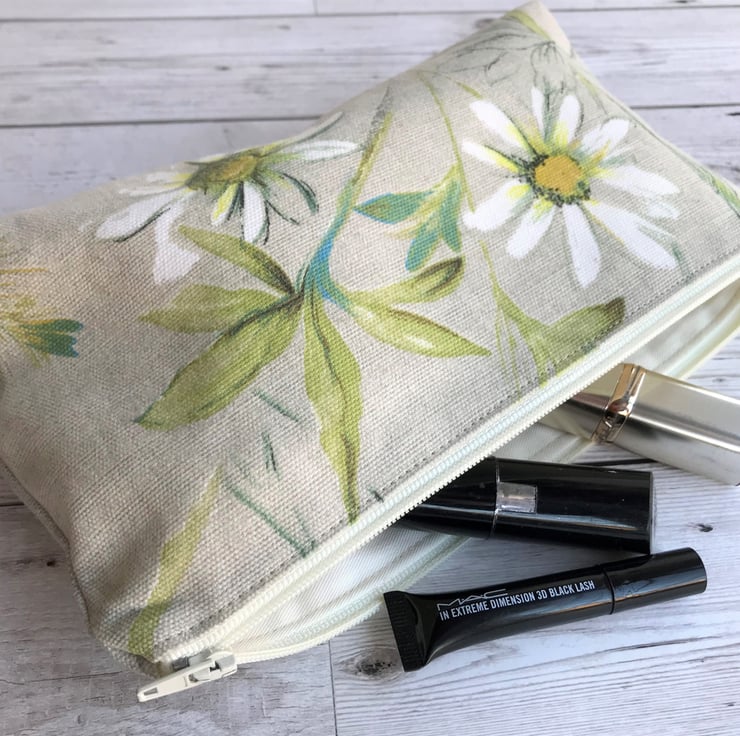 A pretty cosmetic bag in a beautiful summer meadow print pattern. The pattern features cream and golden yellow daisies and foliage in zesty shades of green on a pale beige background. The make up bag fastens with a pale cream zip and is lined with cream fabric. The base of the bag is boxed giving lots of space inside.