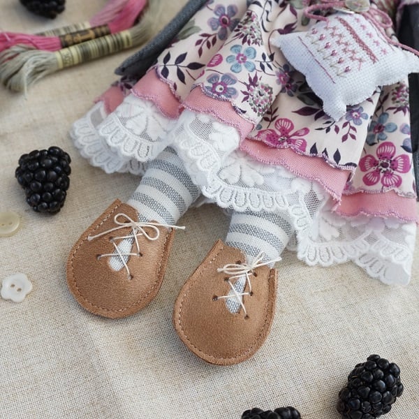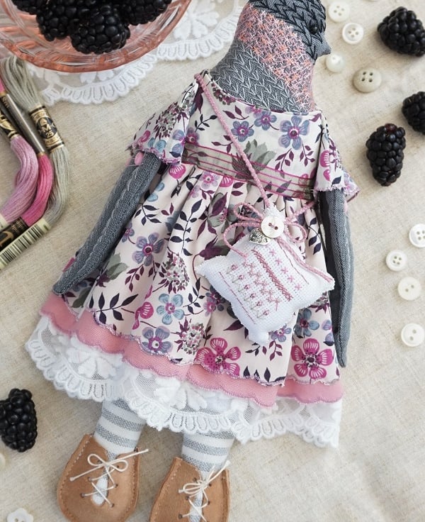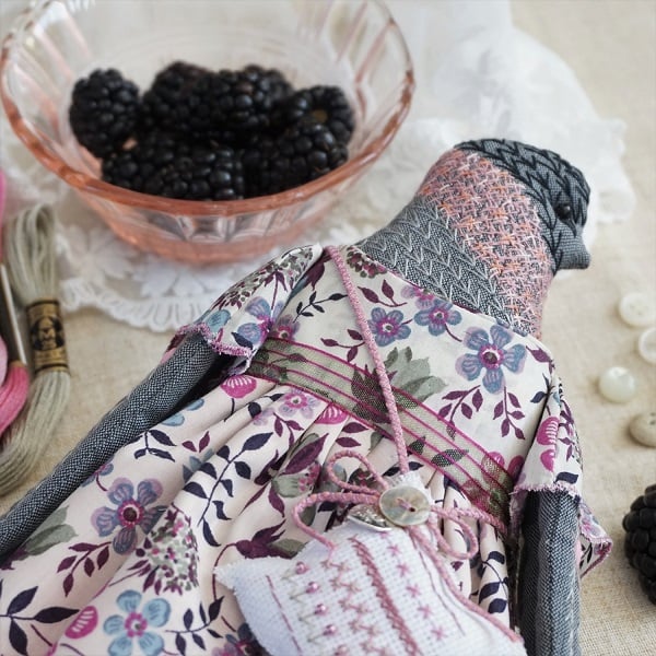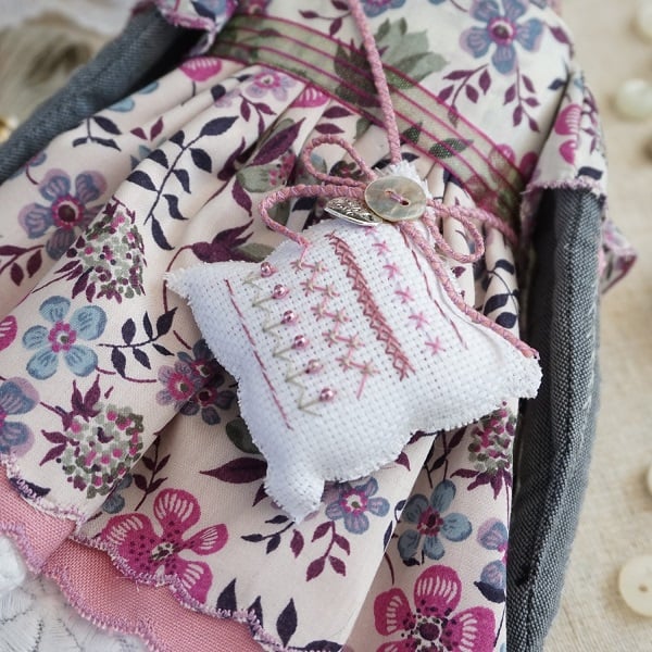 This is Briar, she is a hand embroidered Bullfinch rag doll. I use no paint to delineate the pattern but work freehand embroidery onto self colour cloth to make the plumage both on the front and the back of the doll. Briar is dressed in a pretty deep pink patterned cotton lawn from Liberty called Edenham with coordinating underskirt and a final lace underskirt to finish. She has stripy legs and little leather shoes. Her dress is finished with buttons and ribbon and she carries a little lavender sachet that is also embroidered. She has a little brass ring to her back so she can hang.