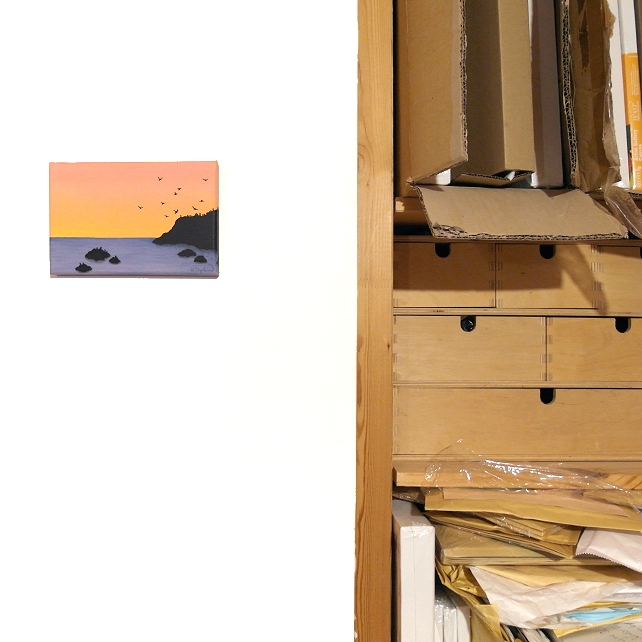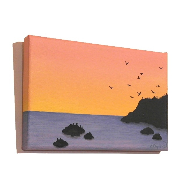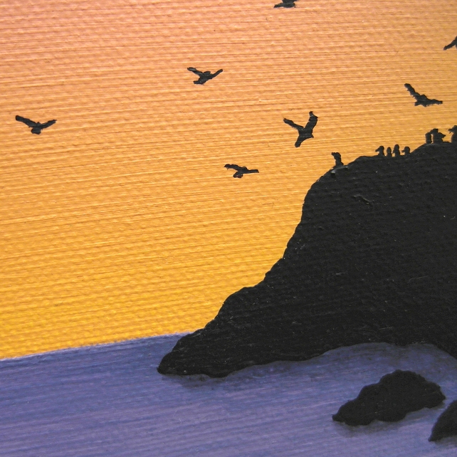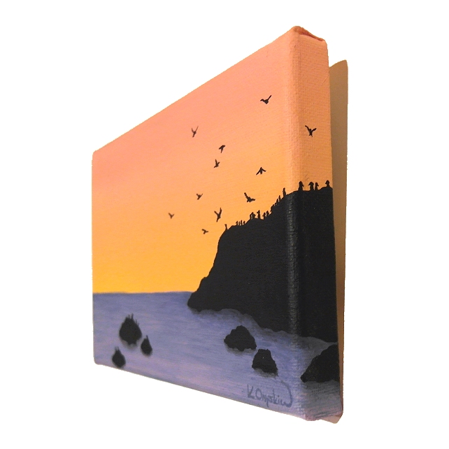 A small canvas painting with the silhouette of birds waking from the coastal rocks, flying into a pinky orange morning sky, beneath them the sea is tinted with purple.