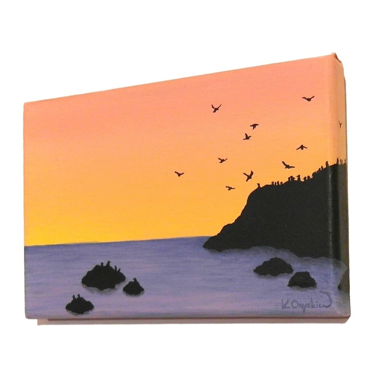 This original dawn seascape is painted in acrylics on a small 12.5cm x 18cm (5" x 7") canvas, The image carries on over the edge of the canvas so there is no need for framing, and a string is attached to the back of the canvas so it is ready to hang.
